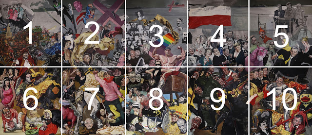 To jedyna okazja żeby w przestrzeni galeryjnej zobaczyć gęsty od narracji historycznych i relacji personalnych oryginał, którego format (430 x 990 cm) imponuje, który precyzją warsztatową wprawia w zdumienie, i który z założenia łamie wszelkie możliwe tabu. Obraz powstawał ponad trzy lata, a dzieło składa się z dziesięciu fragmentów o intrygujących tytułach: