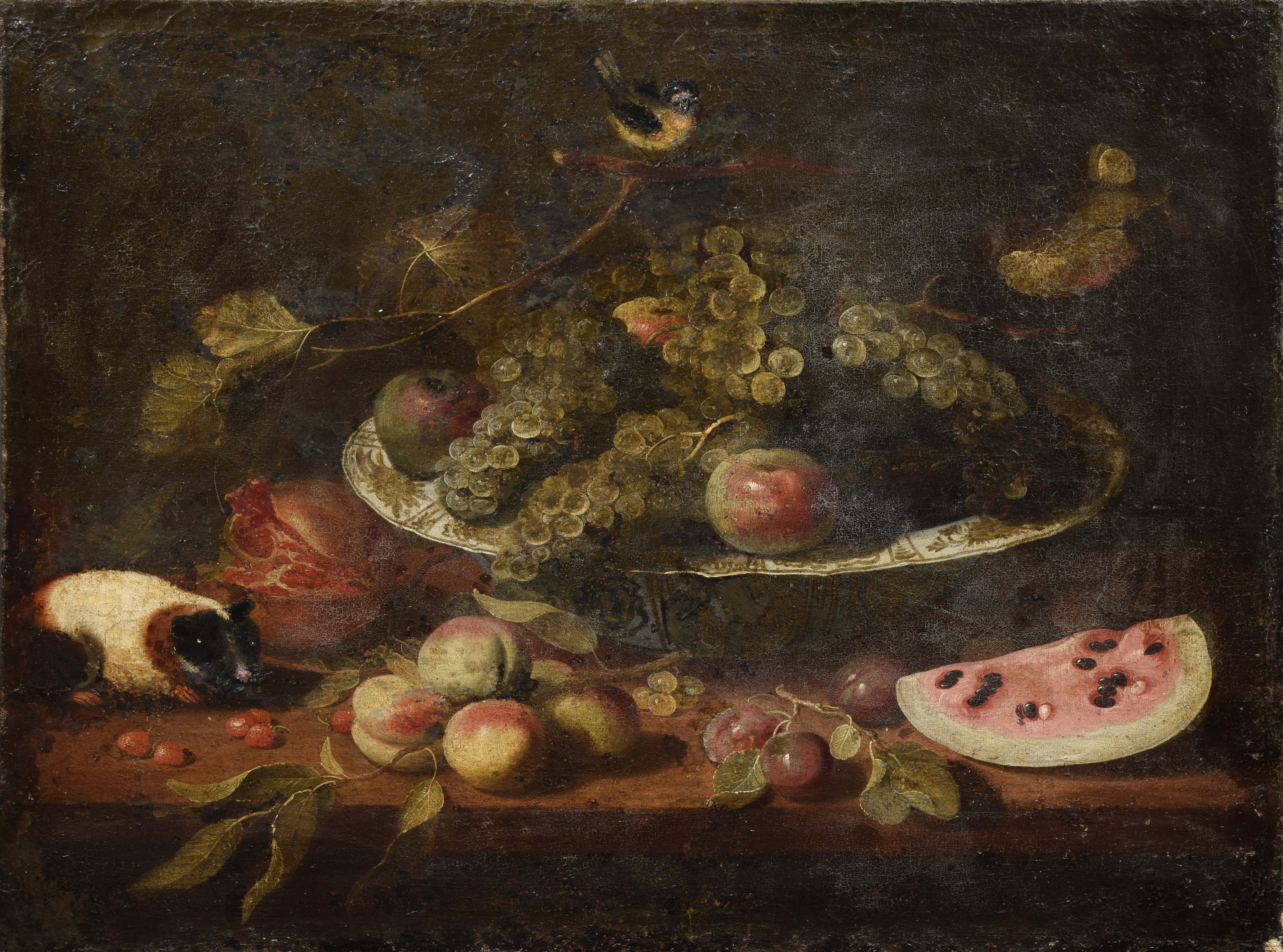 Martwa natura z winogronami, sikorką i myszoskoczkiem