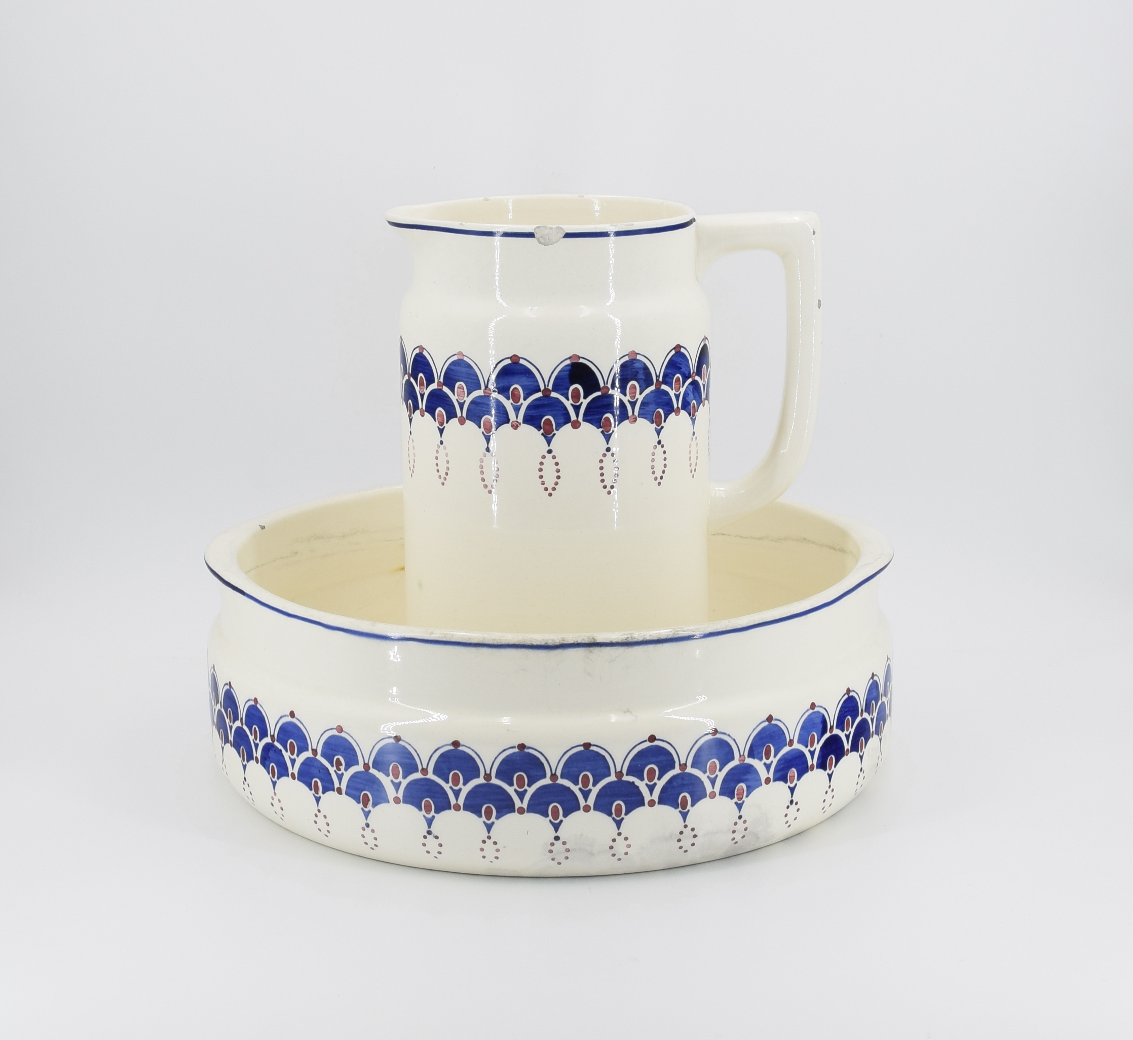 fajans, druk podszkliwny przez szablon i dekoracja ręczna, szkliwo ołowiowe z niewielką krakelurą;