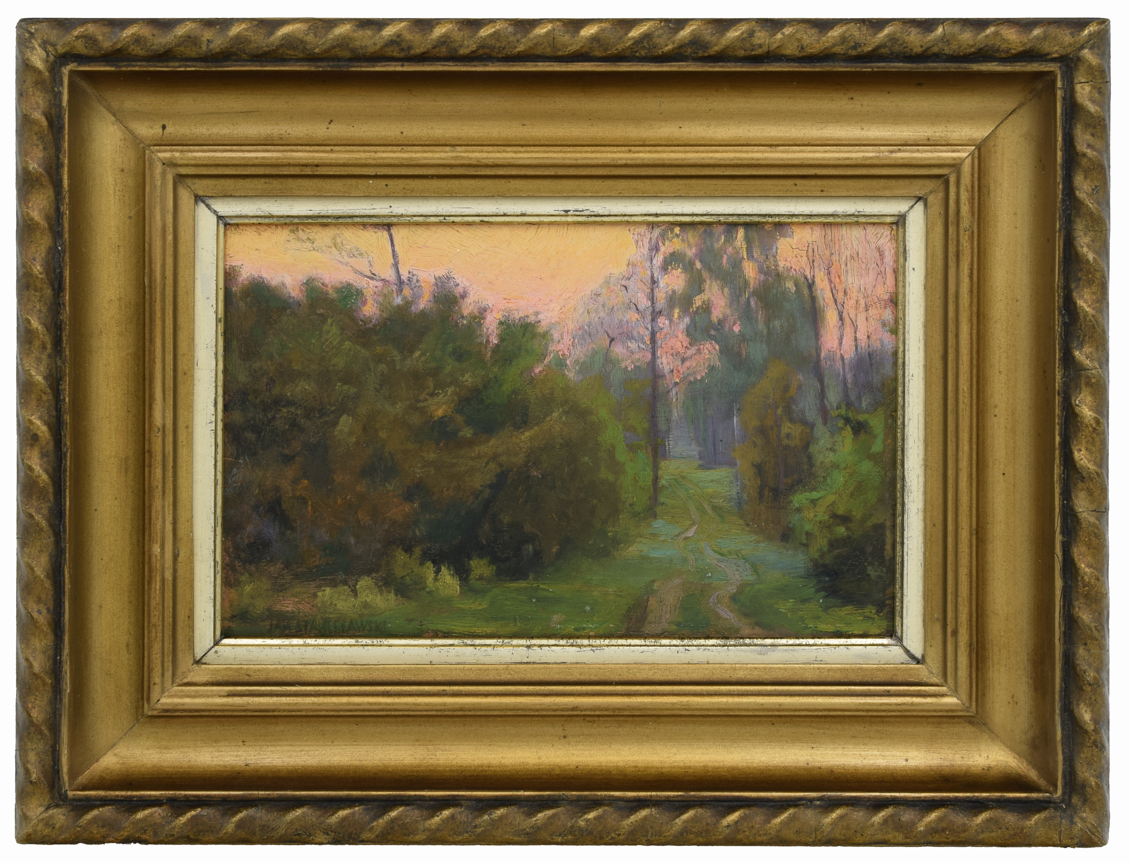 Jan Stanisławski to wybitny pejzażysta, który w 2. poł. XIX w. uczynił głównym bohaterem swoich dzieł naturę, zamykając pejzaż pełen światła, żywiołów i ekspresji w małych formatach swych obrazów. Artysta był profesorem krakowskiej Akademii Sztuk Pięknych, gdzie prowadził pracownię malarstwa pejzażowego, stosując rewolucyjną w tamtych czasach metodę pracy w plenerze. Równocześnie zachęcał swoich studentów do badania potęgi i piękna przyrody. Sam robił to malując zarówno jej detale, jak pojedyncze bodiaki, malwy, bzy, słoneczniki, jak i prezentując moc natury w szerszych kadrach, operując szerokim planem w kompozycjach przedstawiających rozlewiska Dniepru, pola kapusty, alejki parków botanicznych, czy podobnie jak oferowany obraz „Zachód słońca” podejmując temat brzasku, świtu, zmierzchu oraz nokturnu. Pozbawiony ożywionych stworzeń pejzaż, często uchwycony w trakcie przemiany, na przełomie pór roku czy też dokumentujący dobowy cykl natury, stał się dla artysty doskonałym tematem. Jan Stanisławski urodził się w Olszanie na Ukrainie. Często wracał do rodzimych stron, również tam udając się w plener, o czym świadczą obrazy z niewielkich wsi, takich jak np. Śmiła, Korsuń, Zofiówka czy Pustowarnia (Dawna Gubernia Kijowska).