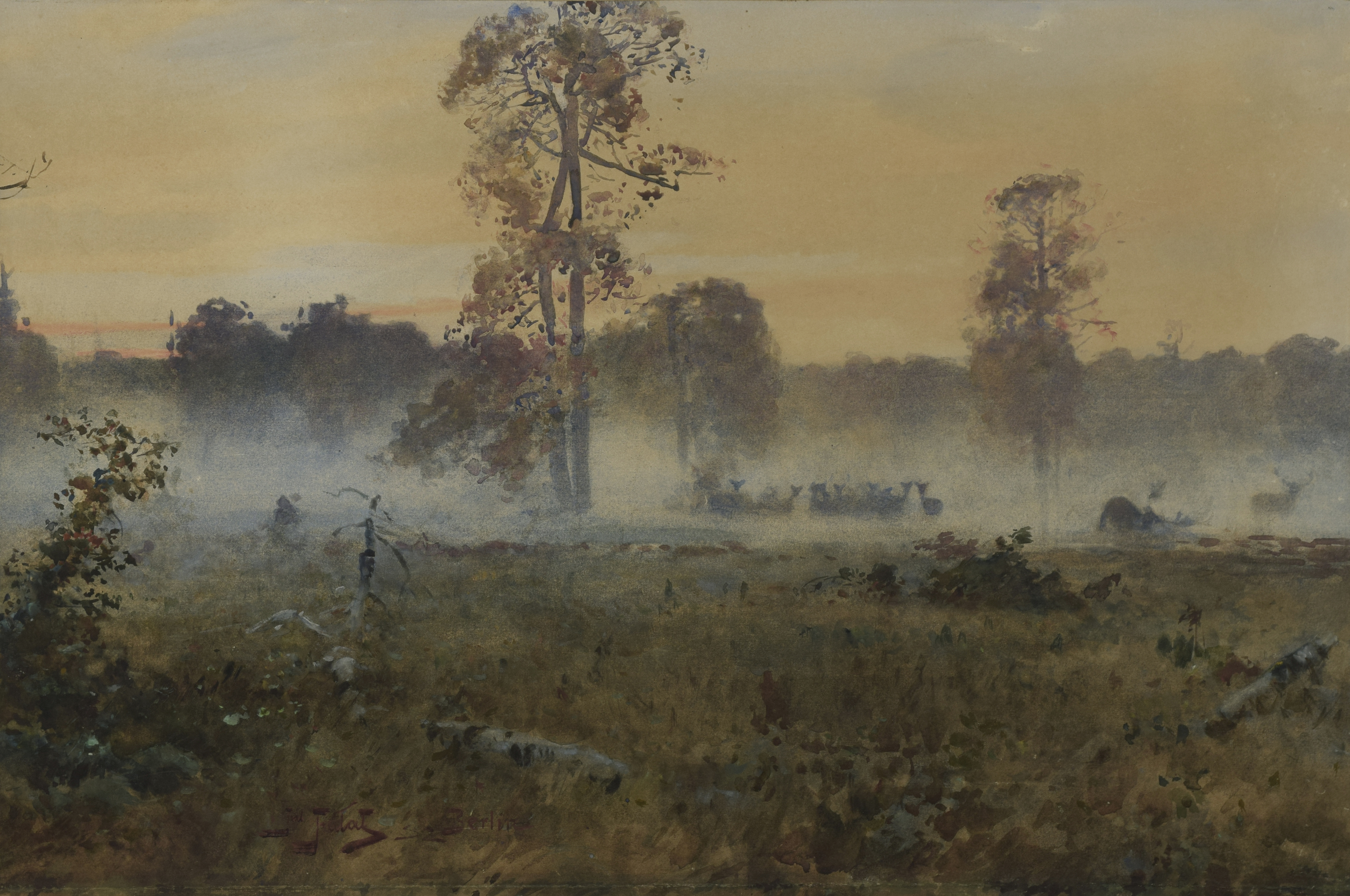 Prezentowane dzieło Juliana Fałata to doskonała ilustracja podsumowująca jego drogę artystyczną, związaną z przedstawieniami myśliwskimi, które w tamtym czasie istotnie zajmowały również innych wybitnych malarzy, takich jak Wojciech Kossak czy Józef Chełmoński. Warto zwrócić uwagę, że dla Juliana Fałata tematyka ta była pretekstem do ukazania przyrody i światła, często za pomocą dużych kontrastów barw, szczególnie w dziełach przedstawiających ośnieżony krajobraz. Dlatego w znanych nam obrazach artysty grupy myśliwych bywają często usunięte z pierwszego planu kompozycji. Na inspirację tematyką myśliwską miała wpływ również literatura, a dokładnie powstanie w 1866 roku Roku myśliwskiego autorstwa Wincentego Pola, do którego ilustracje opracował właśnie Wojciech Kossak. Julian Fałat w 1890 roku stworzył własny Kalendarz myśliwski, opublikowany w Tygodniku Ilustrowanym. Równocześnie ogromny wpływ na odrębność twórczą Juliana Fałata, w porównaniu do innych malarzy tego czasu, miało uczestnictwo artysty w polowaniu w Nieświeżu, zorganizowanym w 1886 roku przez Radziwiłłów dla przyszłego cesarza Wilhelma II. To tam Julian Fałat zaprezentował swoje akwarele i stworzył 27-28 kompozycji, zyskując możliwość pracy dla cesarza Wilhelma II oraz uznanie w berlińskim środowisku artystycznym, gdzie konsekwentnie organizował wystawy sztuki polskiej. Artysta tworzył szkice z natury. Dokumentując liczne polowania, jako temat przewodni wybrał polowanie na sarny, które tworzył do 1889 roku. Następnie, od 1891 roku, zwrócił się ku przedstawianiu króla lasu - łosia. Z czasem, właśnie w okresie berlińskim, rozszerzył repertuar pejzażu o jesienne krajobrazy malowane niemal impresyjnie, w duchu romantyzmu, z tylko symbolicznie zaznaczoną zwierzyną, jak w oferowanym dziele, Rykowisko pochodzącym z najbardziej cenionego okresu, czyli z lat 1890-1895. Następnym etapem w twórczości malarza było zwrócenie się ku poleskim, podmokłym pejzażom.