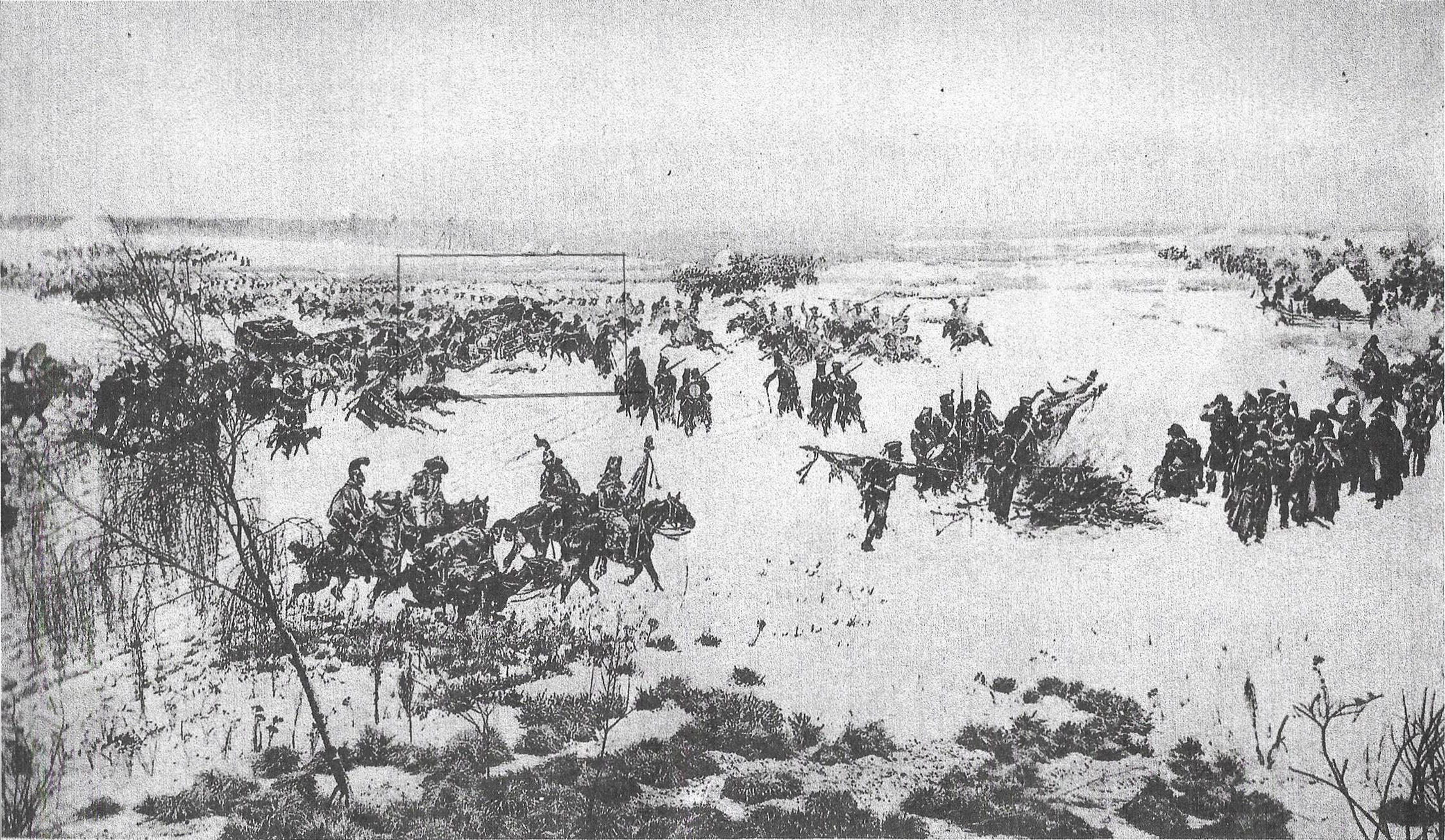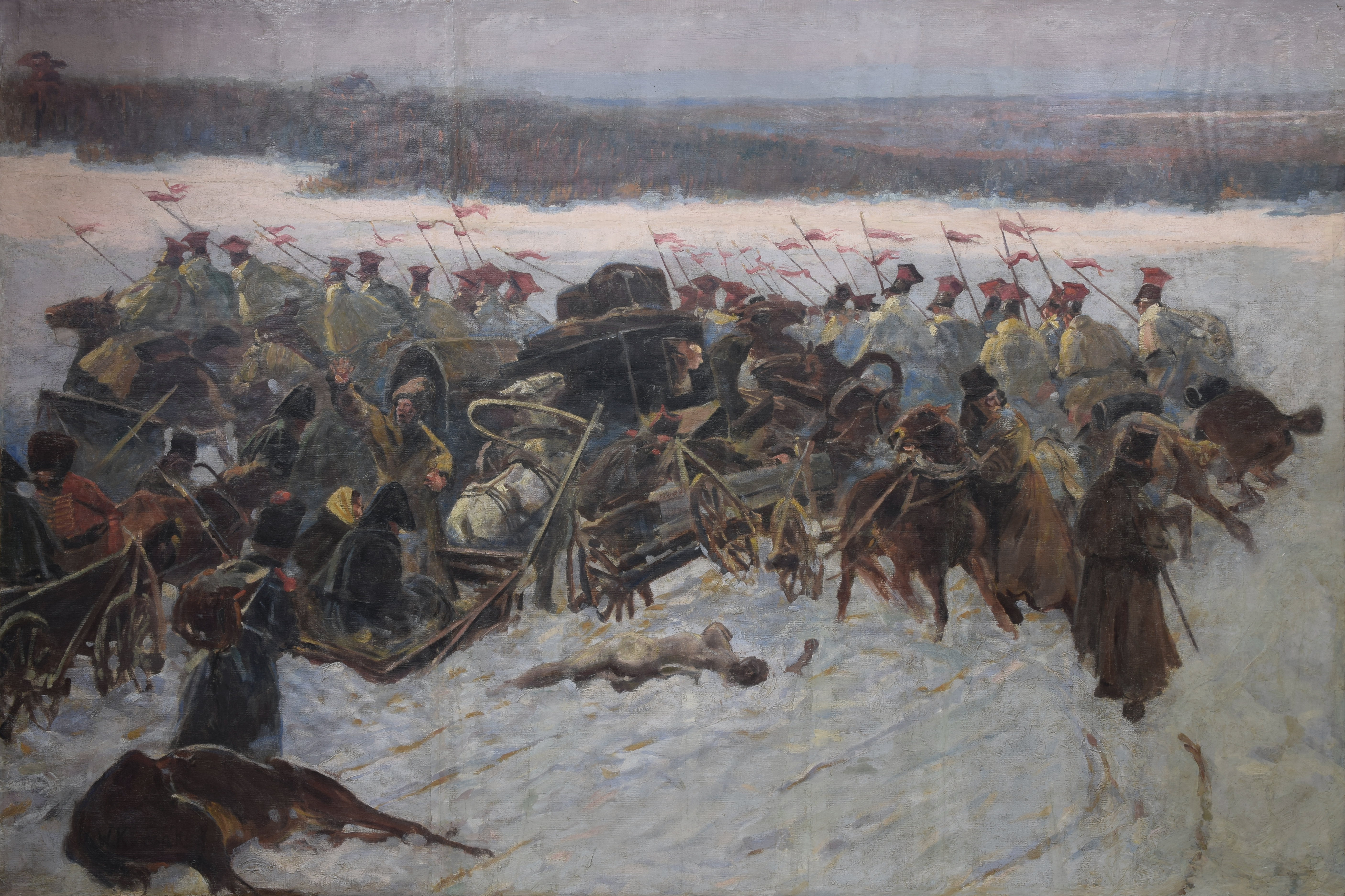 Historia tworzenia malarskich panoram sięga aż XVIII wieku, a już u schyłku XIX wieku cieszyły się ogromną popularnością. Tradycja ta początkowo kwitła na terenie Wielkiej Brytanii, Szwajcarii czy Holandii. Jej recepcja na polskim gruncie została nacechowana silnym wydźwiękiem patriotycznym, gdzie pod pretekstem uznania dla zaborców podkreślano męstwo i odwagę polskich żołnierzy, w przypadku bitwy pod Berezyną służących pod sztandarem napoleońskim oraz pamiętnych zrywów narodowych. Po ogromnym sukcesie Panoramy Racławickiej, upamiętniającej 100. rocznicę insurekcji kościuszkowskiej, a zaprezentowanej pierwszy raz w 1894 roku, Wojciech Kossak zapewnił sobie rozgłos i sławę wybitnego batalisty. Już we wrześniu 1894 roku zostało powołane konsorcjum, pod kierunkiem Juliana Fałata oraz Wojciecha Kossaka, którego celem było namalowanie kolejnej panoramy. Jako temat wybrana została przeprawa wojsk napoleońskich przez Berezynę, 28 listopada 1812 roku. Malarze stworzyli projekt kompozycyjny podzielony na cztery części: Mosty na Studziance, Wzgórze Stachowej, Szarża szwoleżerów, palenie sztandarów na tle wsi Bryl oraz Cmentarz, biwak starej gwardii na tle w oddali Wesołowo i błota Berezyny. Wojciech Kossak był odpowiedzialny za bogate pole figuralne, natomiast Fałat podjął się malowania krajobrazu pokrytego tak rozumianym przez niego śniegiem. Do współpracy zaproszeni zostali Michał Wywiórski, Antoni Piotrowski, Kazimierz Pułaski i Jan Stanisławski. Prace nad dziełem trwały 16 miesięcy. Pierwszy etap miał miejsce w krakowskiej pracowni Wojciecha Kossaka, następny w berlińskiej, gdzie również odbyła się pierwsza prezentacja monumentalnej kompozycji dnia 1 kwietnia 1896 roku. Panorama osiągnęła ogromny sukces. Wystawiana była również w Warszawie, Kijowie i Moskwie, za każdym razem przyciągając tysiące osób. Niestety, tak jak w wielu innych przypadkach, z powodu osłabnięcia zainteresowania panoramami oraz zatargu między Julianem Fałatem i Wojciechem Kossakiem, dzieło zostało pocięte na części. Od 1907 roku Kossak podmalowywał i uzupełniał jego części, także zmieniając partie pejzażu tak, aby jak najbardziej wyeliminować fragmenty malowane przez Fałata. Powstałe w taki sposób oddzielne obrazy mógł już sprzedawać, jako w pełni jego dzieła.