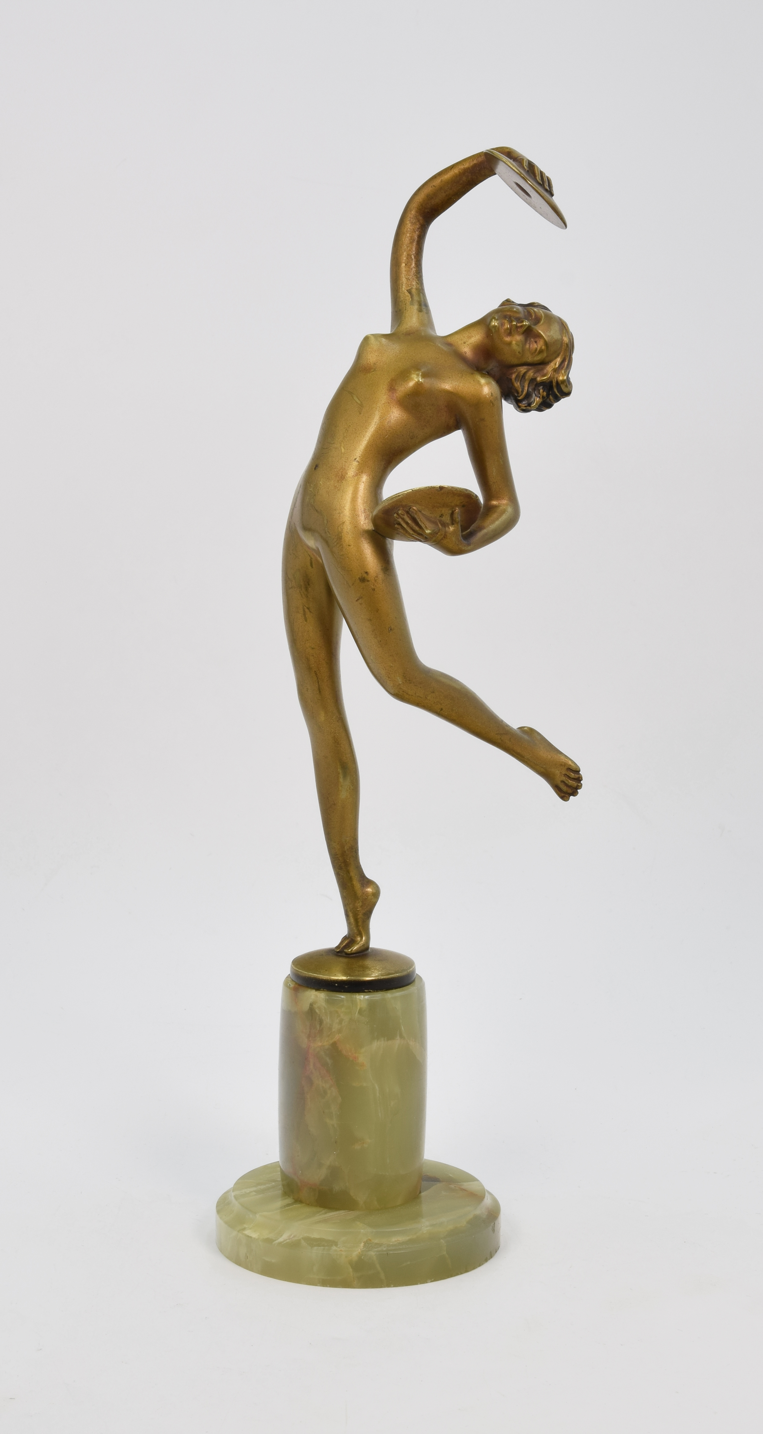 brąz, podstawa - onyks alabastrowy, zielonkawy, z brązowymi żyłkami; wys. 31cm;