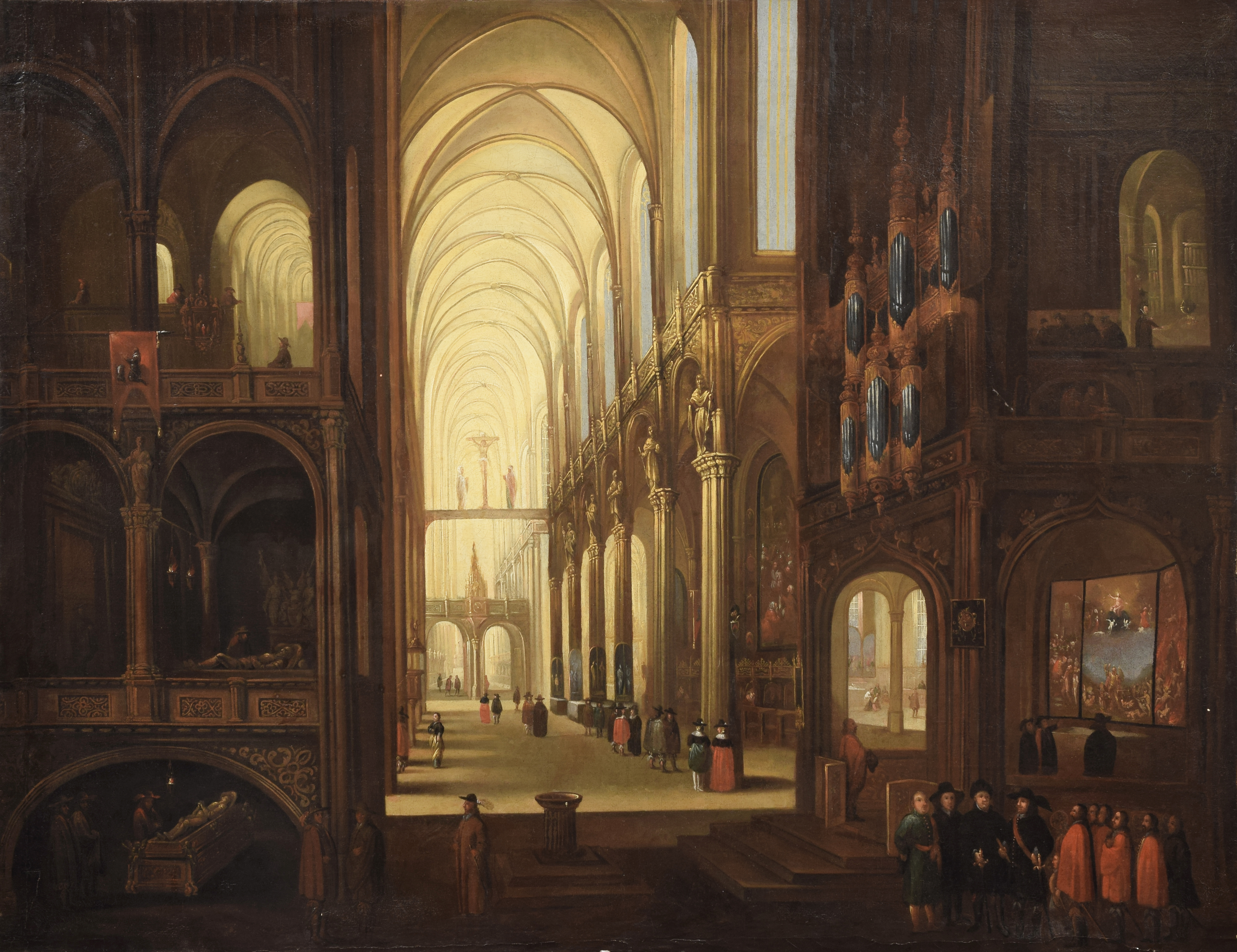 Prezentowany obraz stanowi znakomity przykład północnoeuropejskiego malarstwa architektonicznego XVII wieku, rozwijającego się szczególnie intensywnie w kręgu niderlandzkim. Kompozycja ukazuje monumentalne wnętrze gotyckiej świątyni, zbudowane z rytmicznie powtarzających się arkad, smukłych kolumn i wysokich sklepień, których perspektywiczne skróty prowadzą wzrok widza ku rozświetlonemu prezbiterium. Artysta z dużą biegłością operuje perspektywą linearną i światłem. Jasny, niemal złocisty blask wpadający przez wysokie okna kontrastuje z głębokimi partiami cienia w bocznych kaplicach i pod emporami. Światło nie tylko modeluje architekturę, ale buduje nastrój skupienia i podniosłości. Charakterystyczne dla północnego malarstwa zamiłowanie do precyzji detalu widoczne jest w opracowaniu elementów dekoracyjnych - balustrad, prospektu organowego, rzeźb i ornamentalnych partii kamieniarki. Postacie ludzkie, rozmieszczone w różnych planach kompozycji, pełnią funkcję sztafażu. Są niewielkie w stosunku do monumentalnej architektury, co podkreśla skalę wnętrza i jego sakralny charakter. Ich obecność ożywia scenę, nadając jej wymiar narracyjny i rodzajowy, a jednocześnie nie odciąga uwagi od głównego tematu - gry światła i przestrzeni. Sposób malowania cechuje się staranną, gładką fakturą i umiarkowaną paletą barwną, zdominowaną przez ciepłe brązy, ochry i złamane biele. Subtelne przejścia tonalne i precyzyjne prowadzenie linii architektonicznych wskazują na warsztat artysty dobrze obeznanego z tradycją malarstwa iluzjonistycznego. Dzieło wpisuje się w popularny w XVII wieku nurt przedstawień wnętrz kościelnych, łączących studium architektury z refleksją nad przestrzenią sakralną jako miejscem kontemplacji i wspólnoty. Monumentalność kompozycji, mistrzowskie operowanie światłem oraz harmonijna konstrukcja przestrzeni czynią obraz atrakcyjnym przykładem północnoeuropejskiej sztuki barokowej o wyraźnym, architektonicznym charakterze.