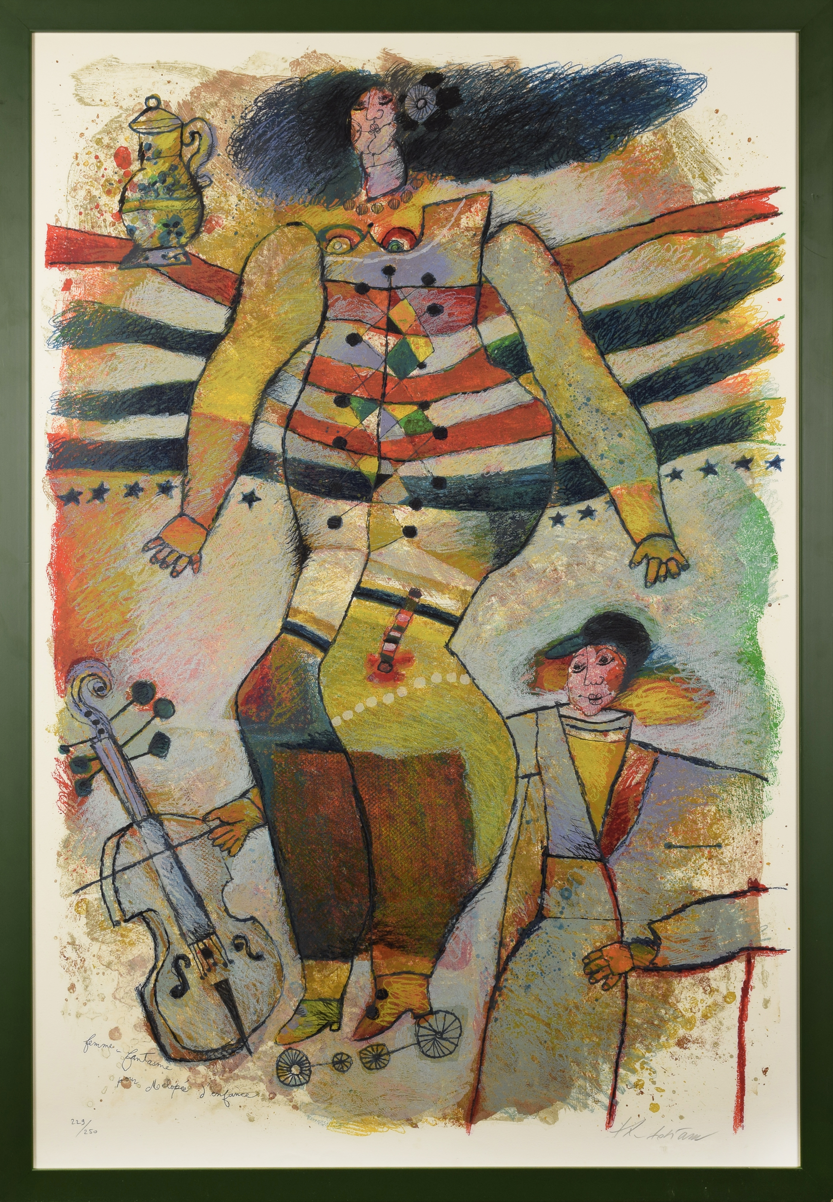 (Fantazja kobiety o melodii z dzieciństwa); litografia barwna, papier Arches; 107 x 73 cm (oprawiona w ramę); edycja limitowana, ręcznie numerowana 229/250 oraz przez autora zatytułowana l. d. i sygnowana p. d.: th tobiasse (ołówkiem). Theo Tobiasse był francuskim artystą, który wyróżniał się w dziedzinie malarstwa, grafiki i rzeźby. Jego życie zostało głęboko naznaczone przez przeżycia z czasów II wojny światowej. Jako dziecko, ukrywał się wraz z rodziną w małym pokoju przez wiele miesięcy, aby uniknąć prześladowań. To doświadczenie stało się powracającym motywem w jego twórczości. Artysta lubił eksperymentować z różnymi technikami, łącząc malarstwo olejne z kolażem, gwaszem czy rysunkiem. Tobiasse był pod wielkim wpływem mistycyzmu i poezji prac swojego przyjaciela Marca Chagalla. Prace Tobiasa są jak utwory muzyczne, ze skomplikowanymi wielowarstwowymi kompozycjami i echem kolorystycznych fantazji, w których jego ulubionymi kolorami są pomarańczowy, czerwony, różowy i niebieski. Theo Tobiasse zdobył międzynarodowe uznanie, a jego prace były wystawiane w najważniejszych galeriach na całym świecie. Oprócz malarstwa, tworzył również imponujące rzeźby i prace graficzne, w tym litografie i akwaforty. Jego spuścizna artystyczna to potężne, emocjonalne świadectwo, które porusza tematykę pamięci, przetrwania i triumfu ludzkiego ducha. Dziś jego dzieła są poszukiwane przez kolekcjonerów i można je znaleźć w wielu prestiżowych kolekcjach prywatnych i publicznych.