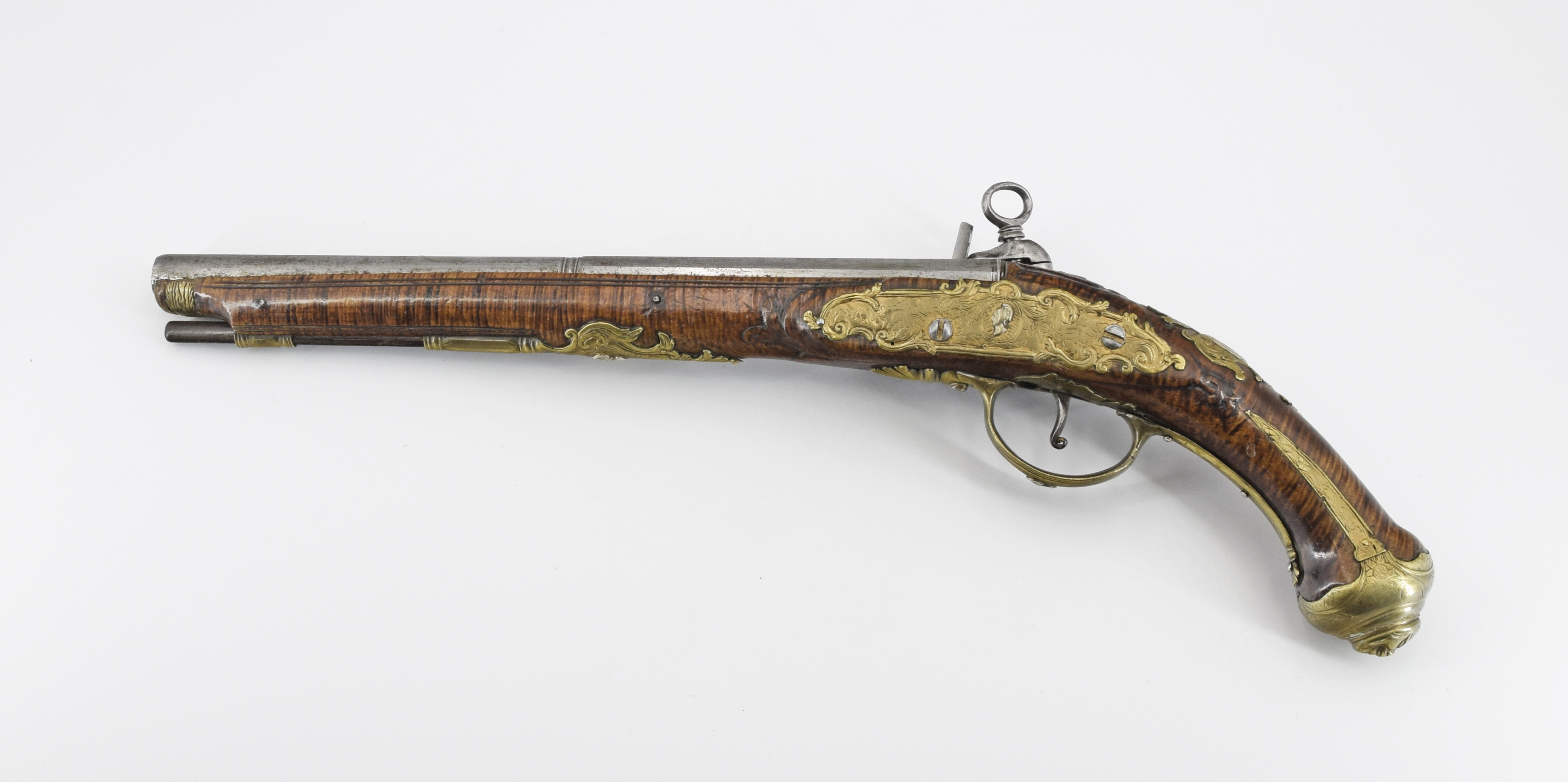 stal, brąz, mosiądz, drewno orzechowe, srebro; dł. całk. 45 cm.