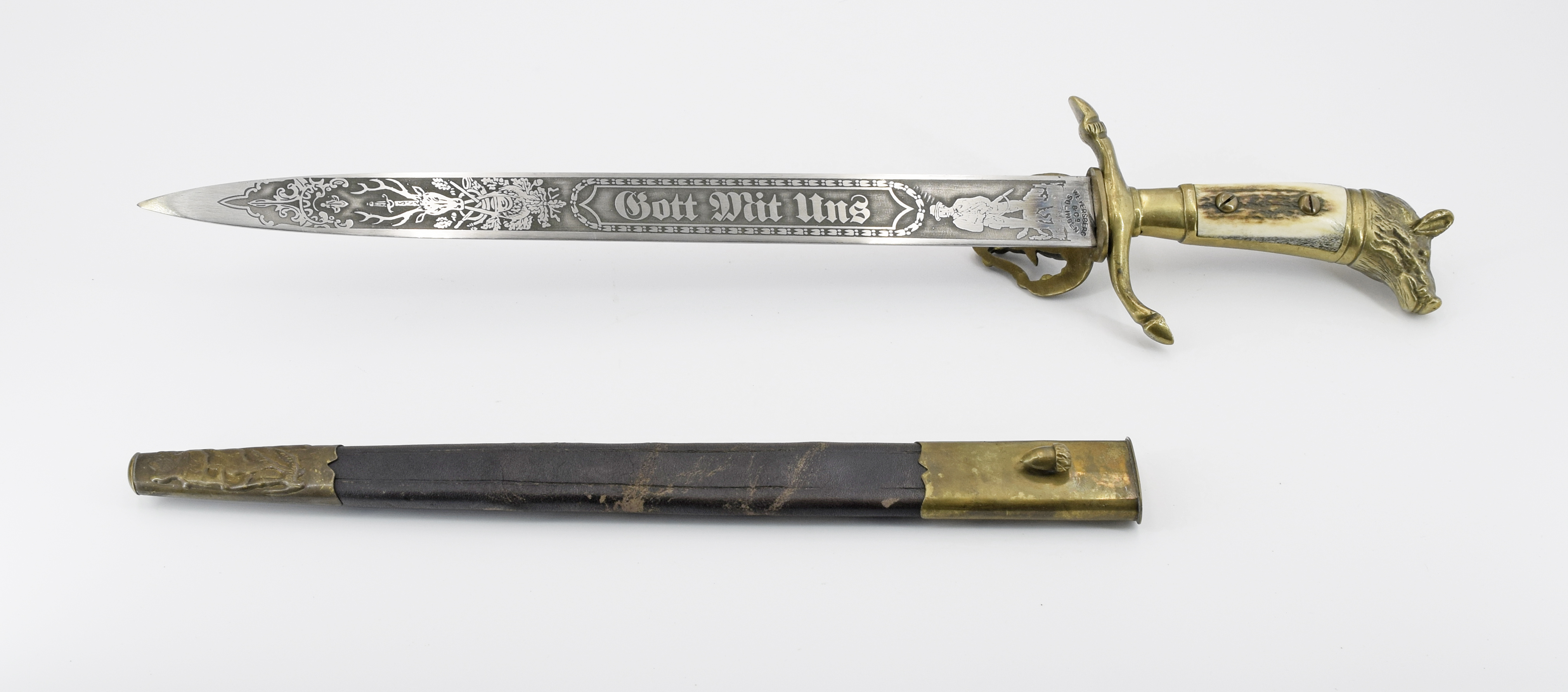stal; na obu płazach trawione napisy i rysunki; brąz; mosiądz; rękojeść - poroże; pokrowiec - skóra; dł. całk. 460 mm;