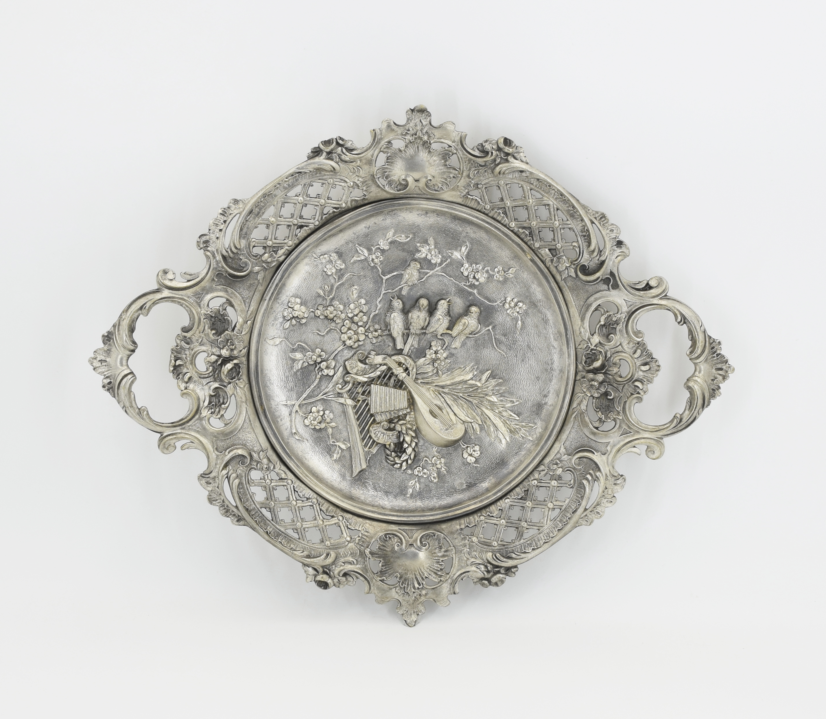stop metali srebrzony cechowany; wys. 4 cm, szer. 41 cm, głęb. 33 cm.