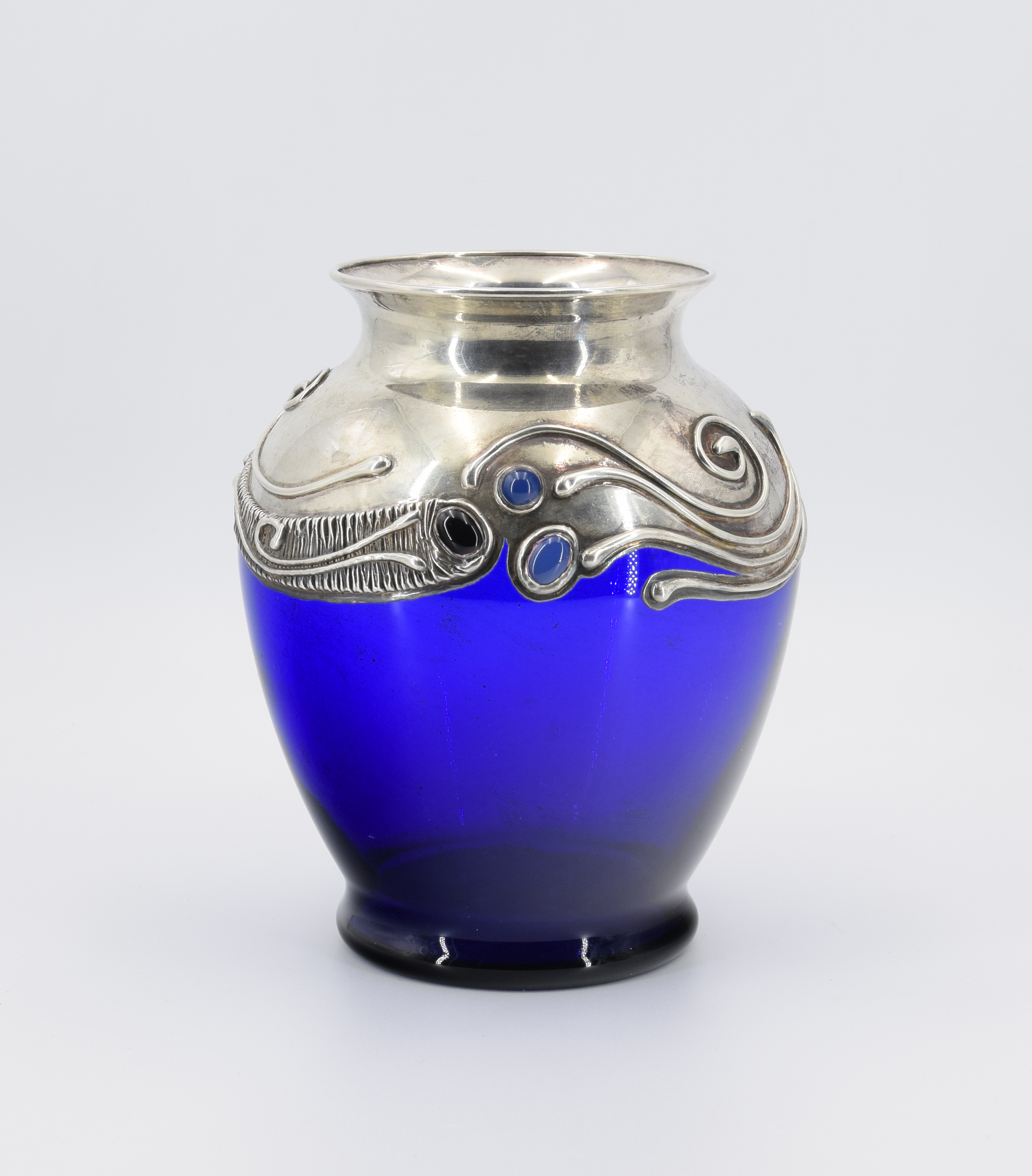 szkło kobaltowe, srebro próby 925 cechowane, kamienie; wys. 18,8 cm, średnica 15,8 cm;