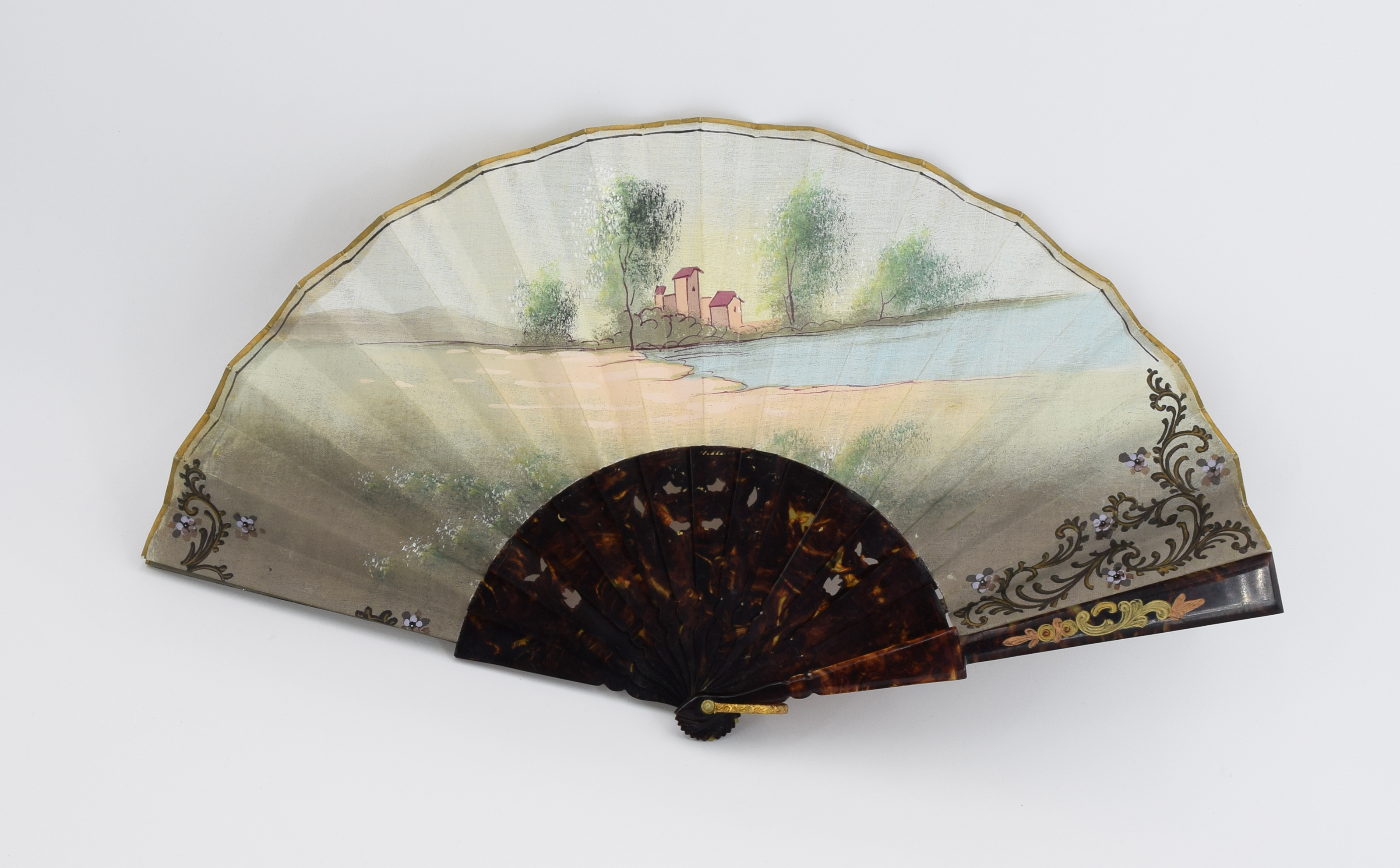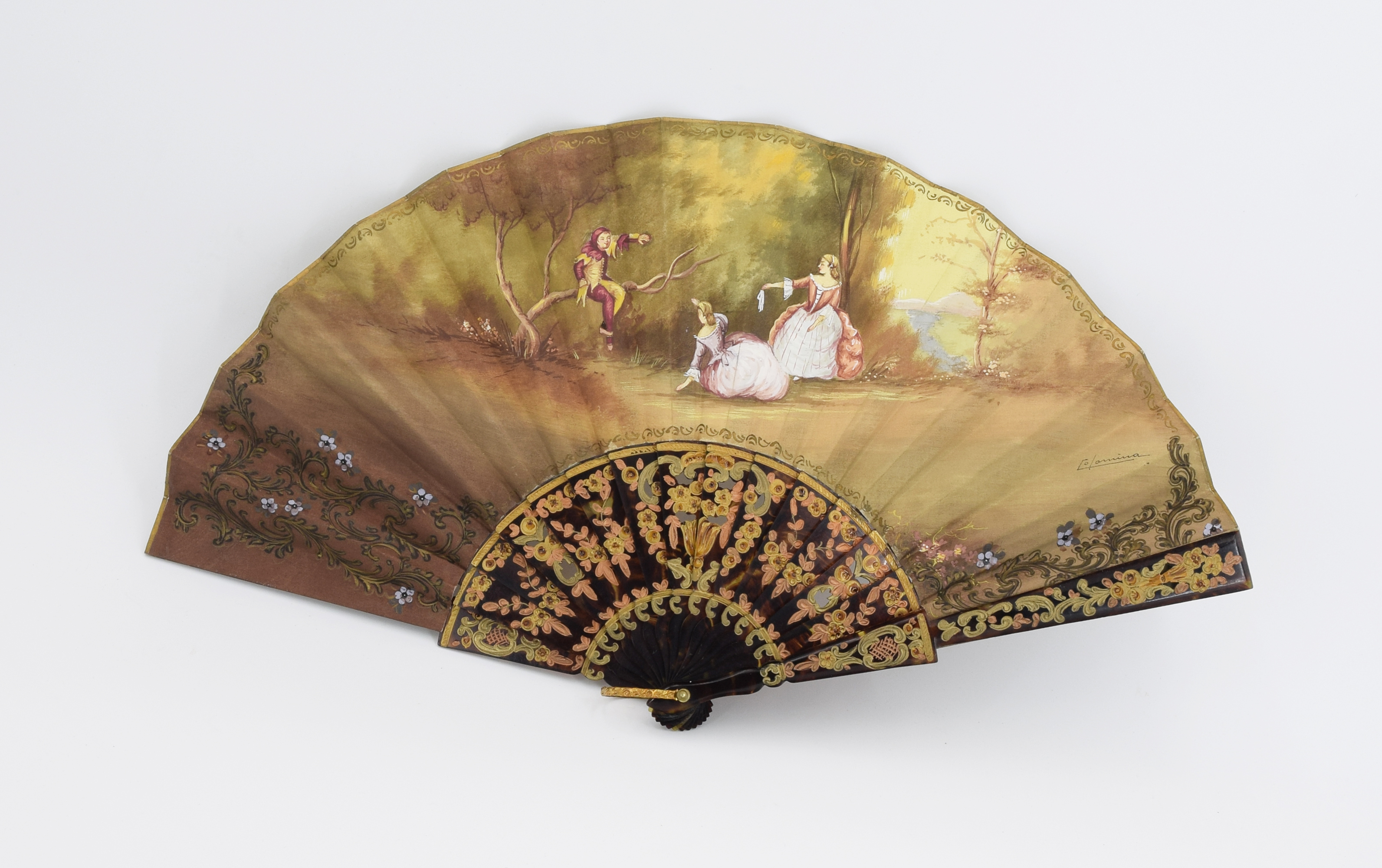 szylkret, skóra z krokodyla, pergamin, gwasz; 42 x 23 cm - rozłożony; sygn.: „Colomina”?; w firmowym etui;