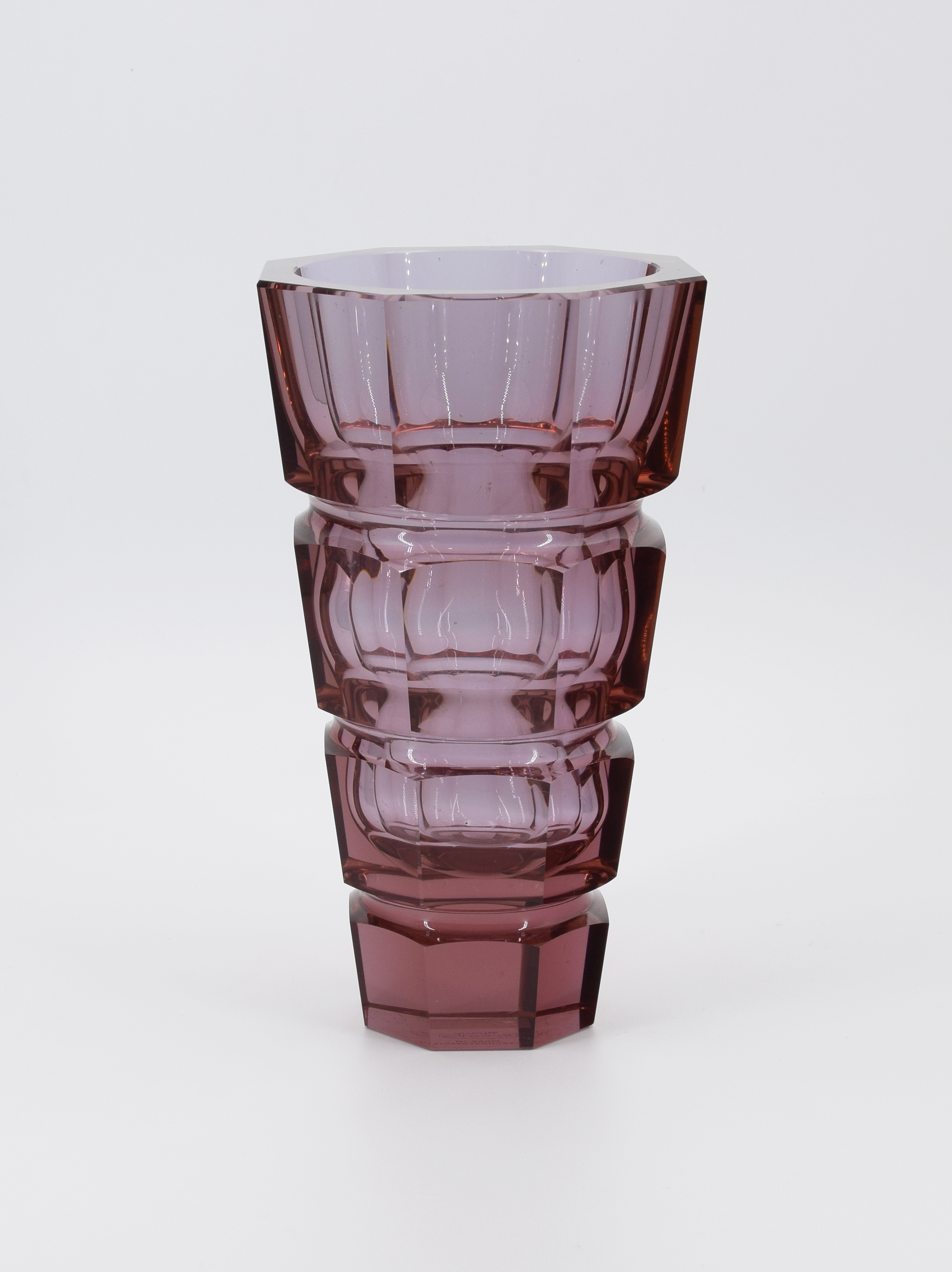 szkło przezroczyste w kolorze rubinowym, szlifowane, wys. 25,5 cm; sygn. na spodzie;