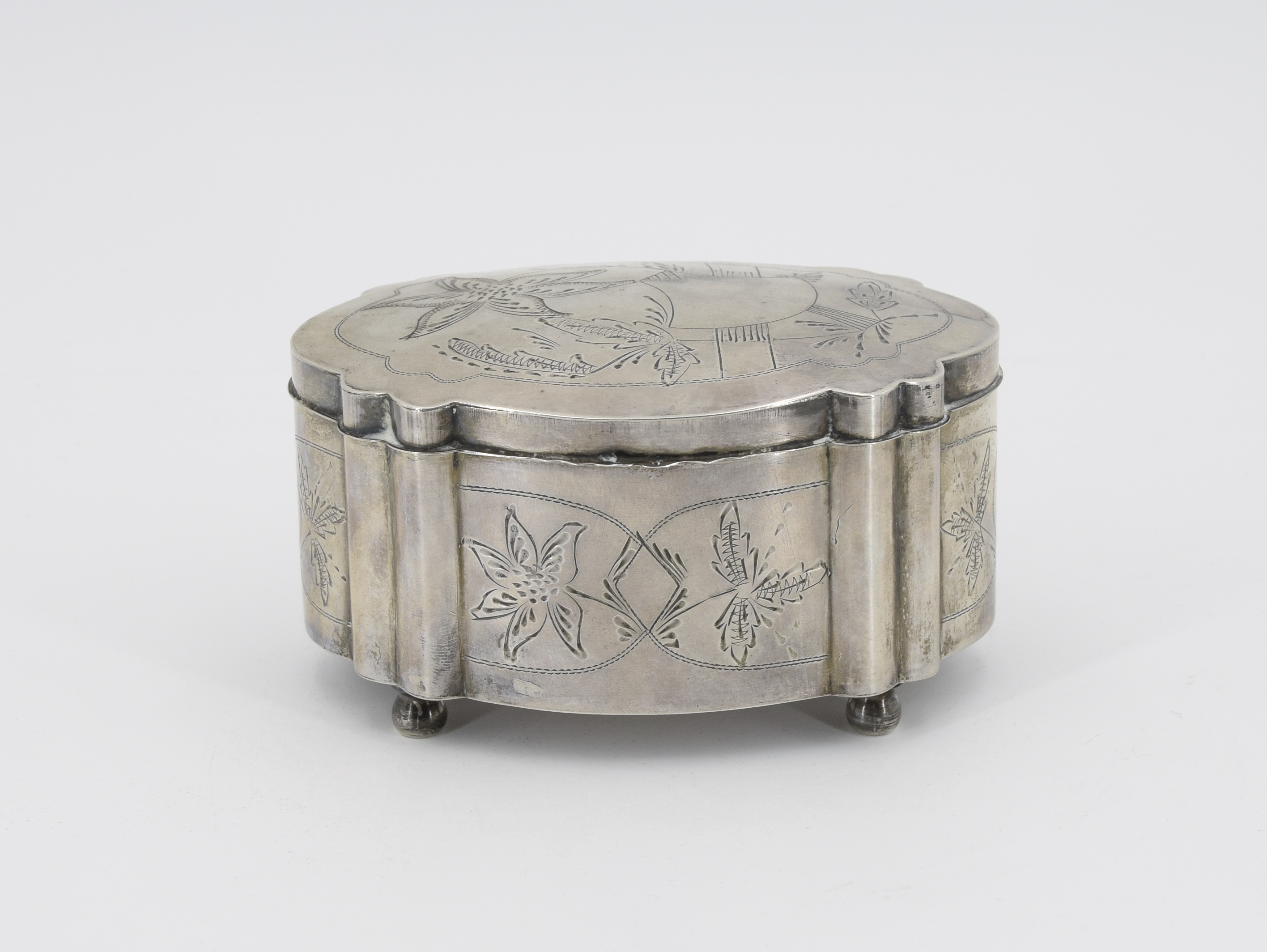 srebro próby 3 cechowane; wys. 7 cm; szer. 13,5 głeb. 10 cm; waga 222 g.
