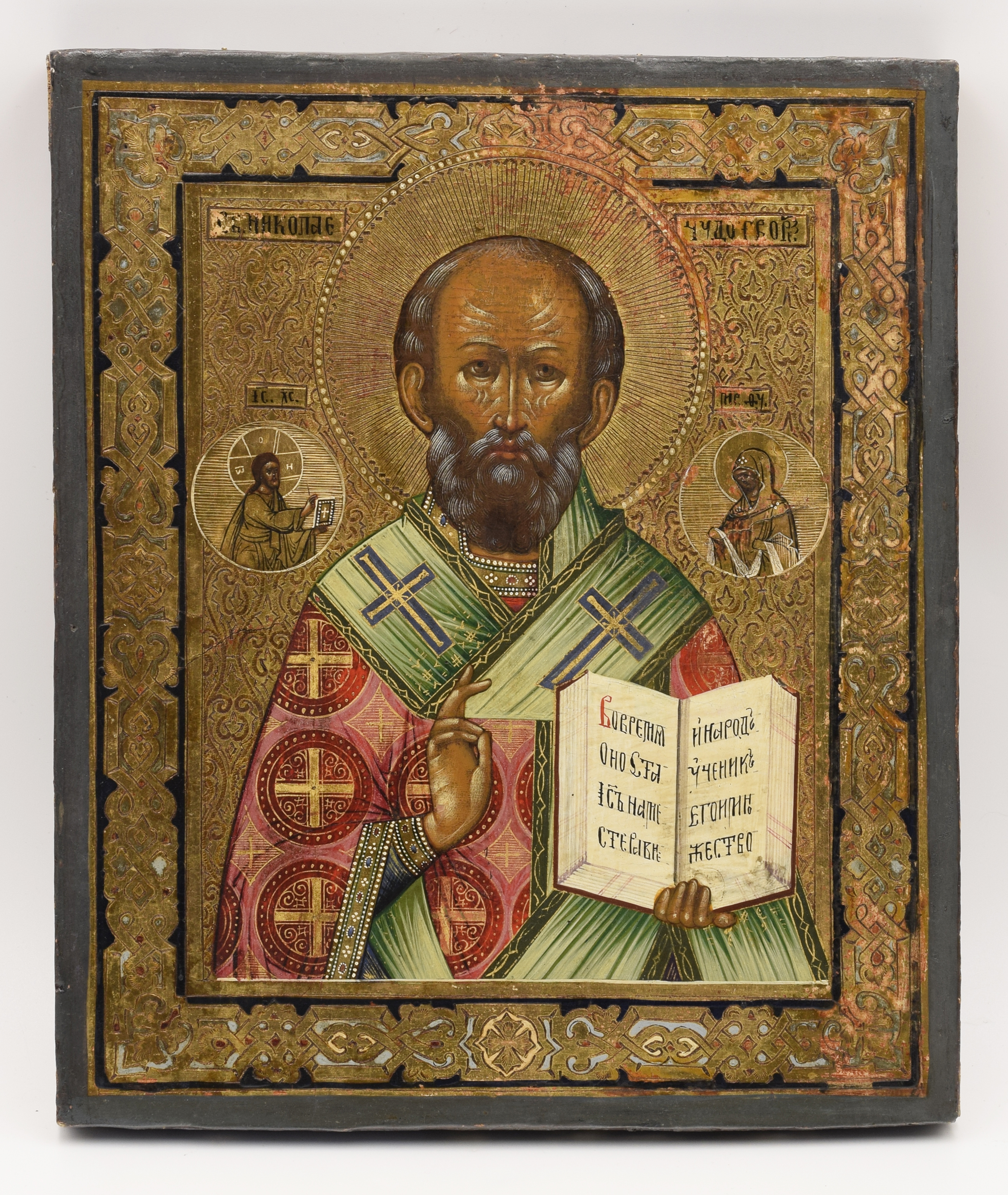 tempera, deska cyprysowa, podkład kredowo-gipsowy, złocenia; 31,3 x 26,2 x 2,4 cm. Rosja, Moskwa, XIX w. Ponadto dwa wsporniki pogrążone w sztorcach ikony; na rewersie napisy. Tło i bordiura ikony złocone, dekorowane ozdobnym grawerunkiem, obramienie ujęte ciemnym pasem. Św. Mikołaj ur. się w Patarze w 280 r., był biskupem Miry - stolicy Licji, gdzie zmarł między 345 a 352 r. Na soborze w Nicei ostro przeciwstawił się heretyckiemu biskupowi Ariuszowi, za co został pozbawiony insygniów biskupich i wtrącony do więzienia. W więzieniu ukazał mu się Chrystus i Matka Boża, którzy zwrócili mu wolność i godność biskupią. Słynął dobrymi czynami i licznymi cudami, stąd uzyskał przydomek Cudotwórca. Na Rusi był opiekunem podróżujących, strzegł od pożarów, troszczył się o urodzaje. Świętemu Mikołajowi w folklorze ludowym przypisywano rolę taką jak najważniejszym Świętym, Aniołom, a nawet Archaniołom. Na wysokości ramion Świętego, w medalionach wyobrażenie Jezusa Chrystusa i Matki Bożej z biskupimi atrybutami. Wizerunek Świętego w półpostaci, frontalnie, z prawą ręką błogosławiącą i lewą trzymającą otwartą Księgę z tekstem w czterech wersach. Na wysokości złoconego nimbu Świętego napisy objaśniające cyrylicą "Swiatoj Nikolaj Ciudotworca"