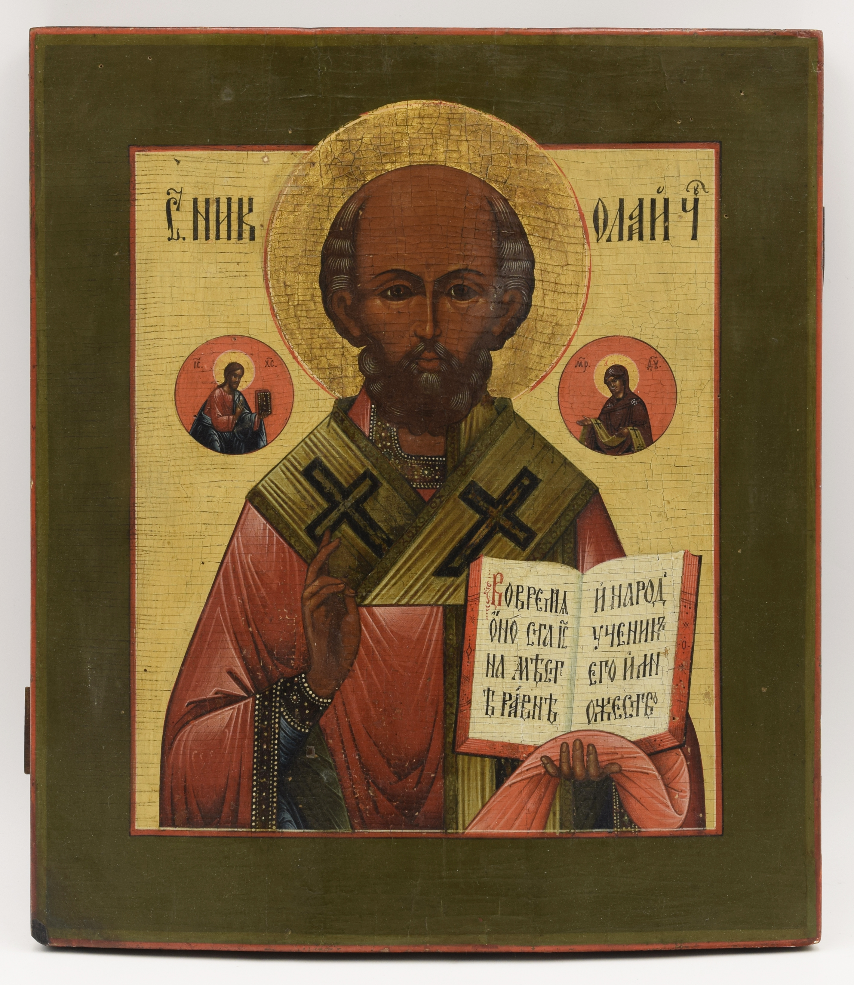 tempera, deska, podkład kredowo-gipsowy, złocenia; 35,7 x 30,9 x 2,4 cm; Rosja, XIX w. Tył ikony - z dwiema szpongami. Tło jasne, bordiura ciemna jednolita ujęta zielonym i czerwonym pasem. Św. Mikołaj - biskup Miry - na soborze w Nicei przeciwstawił się heretyckiemu biskupowi Ariuszowi, za co został pozbawiony insygniów biskupich i wtrącony do więzienia. W więzieniu ukazał mu się Chrystus i Matka Boża, którzy zwrócili mu wolność i godność biskupią. Słynął dobrymi czynami i licznymi cudami, stąd uzyskał przydomek Cudotwórca. Na Rusi był opiekunem podróżujących, strzegł od pożarów, troszczył się o urodzaje. Na wysokości ramion Świętego, w medalionach wyobrażenie Jezusa Chrystusa i Matki Bożej z biskupimi atrybutami. Wizerunek Świętego w półpostaci, frontalnie, z prawą ręką błogosławiącą i lewą trzymającą otwartą Księgę z tekstem w czterech wersach. Na wysokości złoconego nimbu Świętego napisy objaśniające cyrylicą " "Swiatoj Nikolaj Ciudotworca"