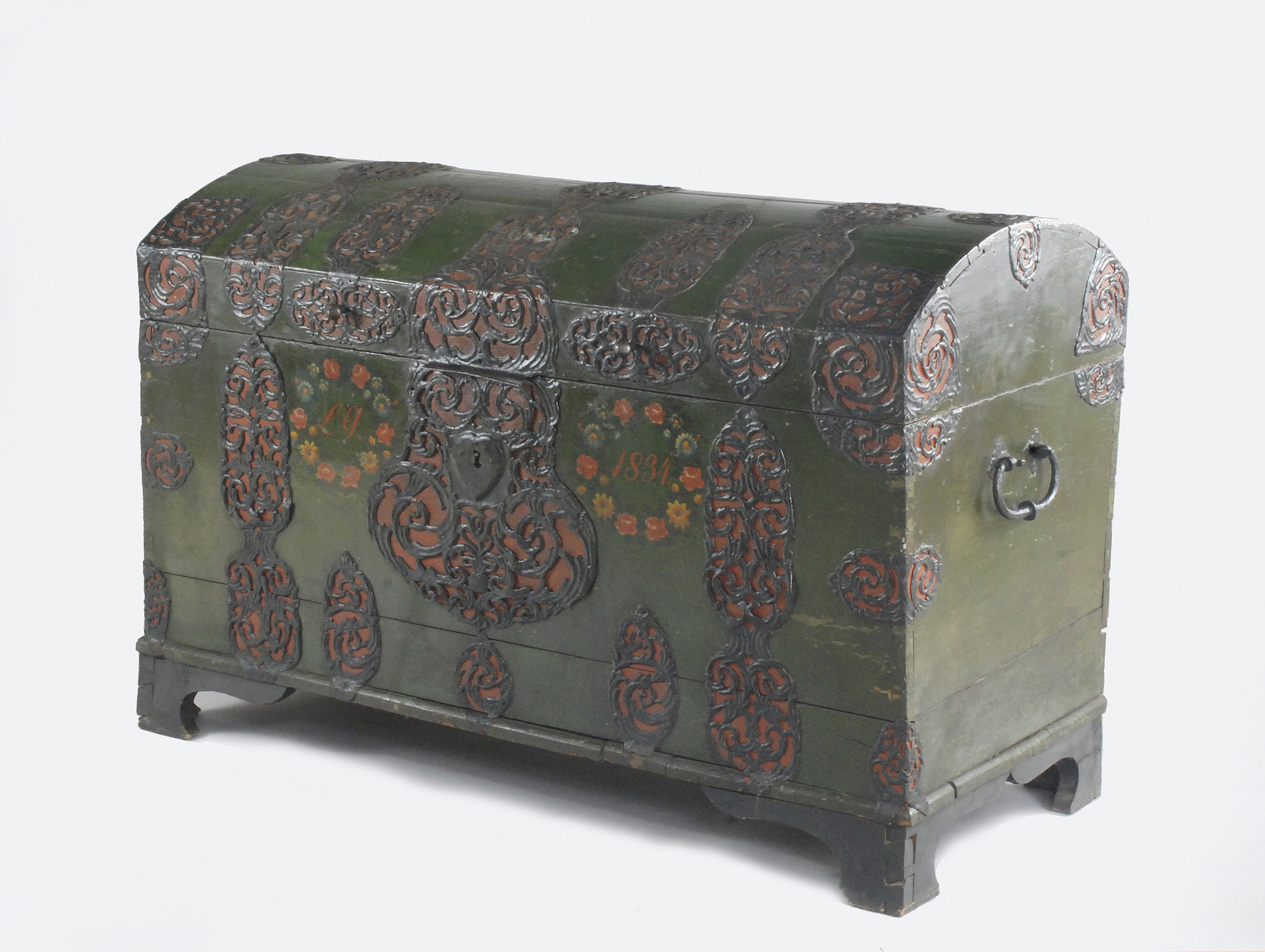 dębina, stal, 71,5 x 148 x 96 cm. Niemcy Północne (?), 1834. Masywny, o bokach ściętych ku dołowi, nakryty wypukłym, odkładanym wiekiem, wsparty na ramie z konsolowymi nóżkami. Cały malowany na ciemno zielono, z dwoma wieńcami kwiatowymi na froncie, w których w lewym inicjały LG, a w prawym data 1834, bogato ozdobiony stalowymi, czernionymi okuciami, ażurowanymi i repusowanymi w formie roślinnych wirów i palmet, podmalowanymi na czerwono, z uchwytami w formie knopików na czole wieka i uchwytami na bokach korpusu. Kufry w tym kształcie i w ten sposób dekorowane okuciami i malaturą, były popularne w XVIII i XIX wieku na terenie Europy Środkowej. Liczne podobne, ze skromniejszymi okuciami znane są z Północnych Niemiec i Pomorza. Często kufry takie wykonywano w związku z nadchodzącym ślubem, jako podarunki narzeczonego dla narzeczonej.