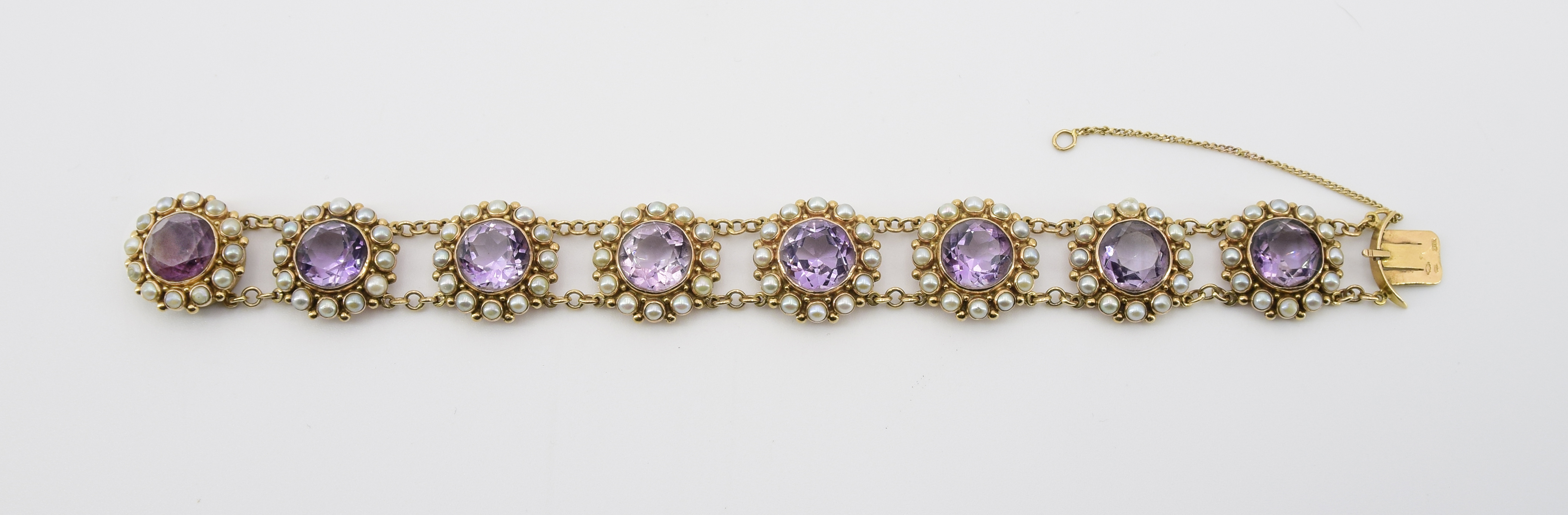 8 szt. okrągłych, fasetowanych ametystów w otoczeniu 96 szt. półpereł;