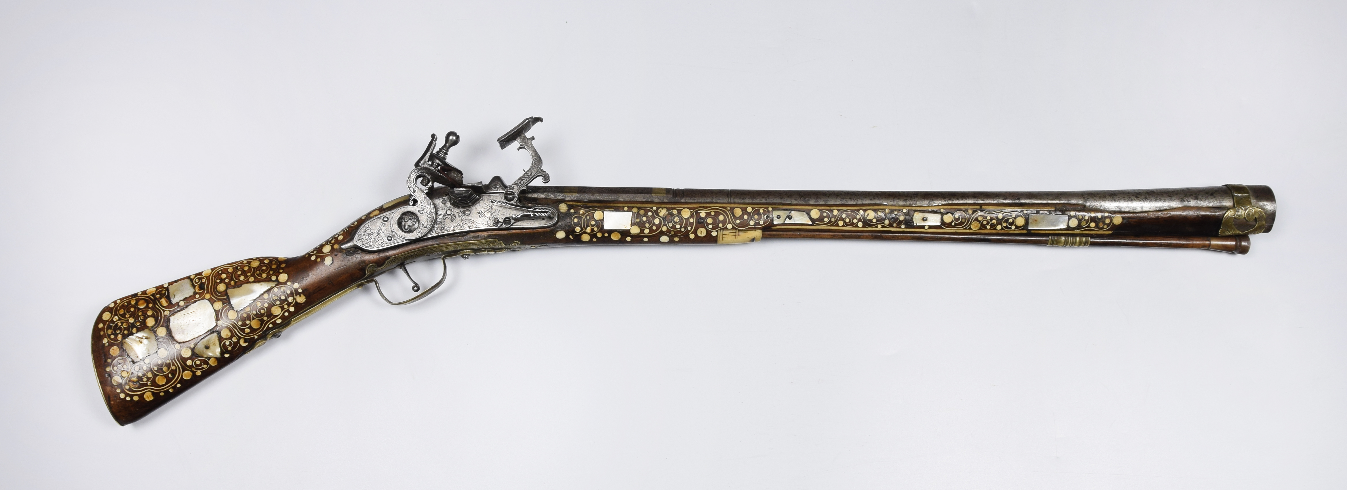 stal, metal, drewno, inkrustowana macicą perłową i kością słoniową, intarsja; dł. całkowita: 80 cm;