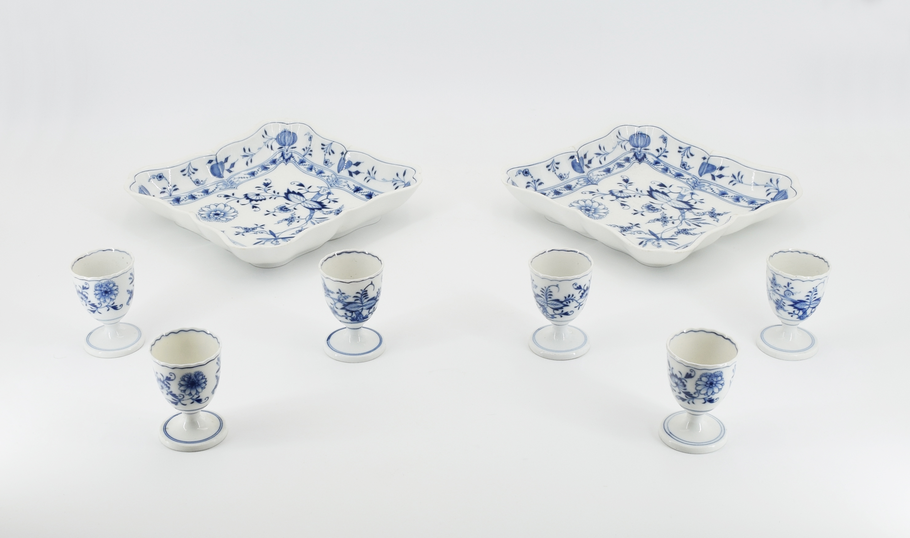 porcelana, kobalt podszkliwny; 6 kieliszków do jajek oraz dwie płytkie paterki;