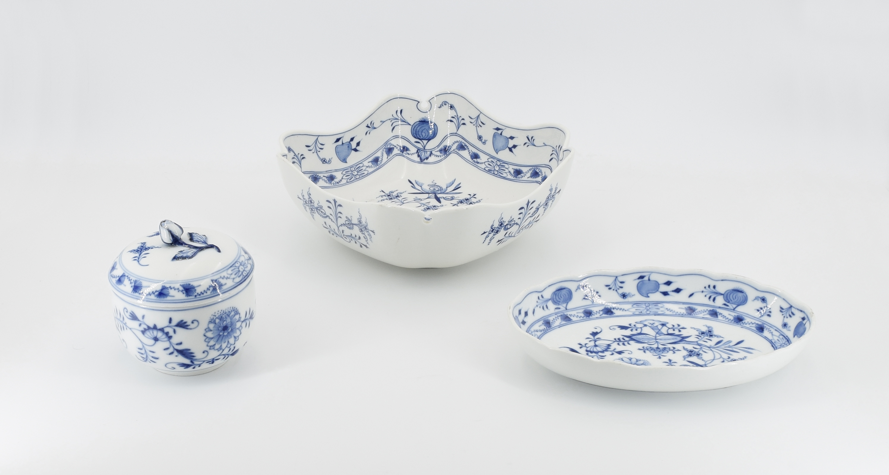 porcelana, kobalt podszkliwny; cukiernica z pokrywką, kwadratowa salaterka i owalna paterka;