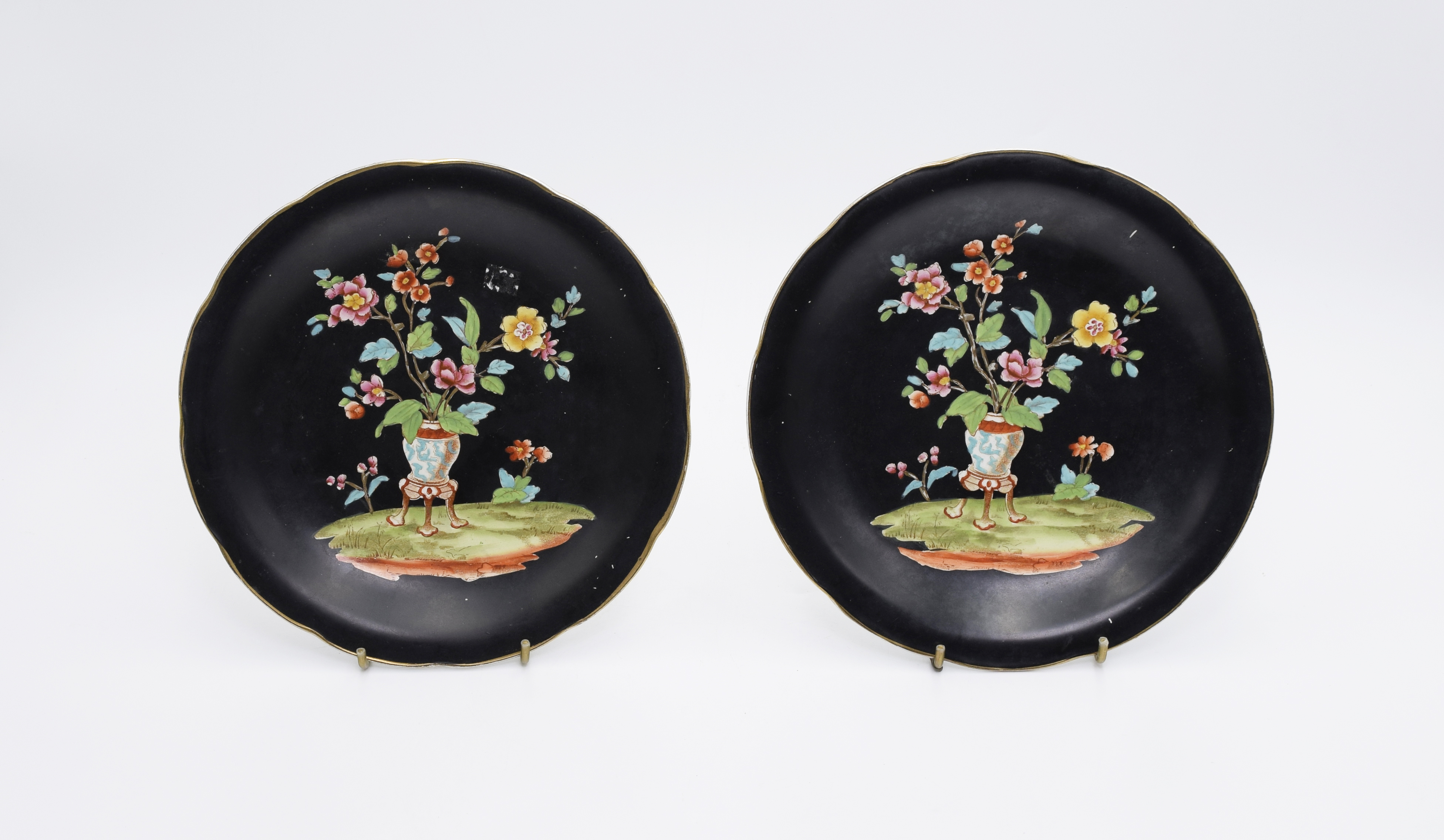 Para talerzy z motywem dalekowschodnim ukwieconej gałązki w wazonie;