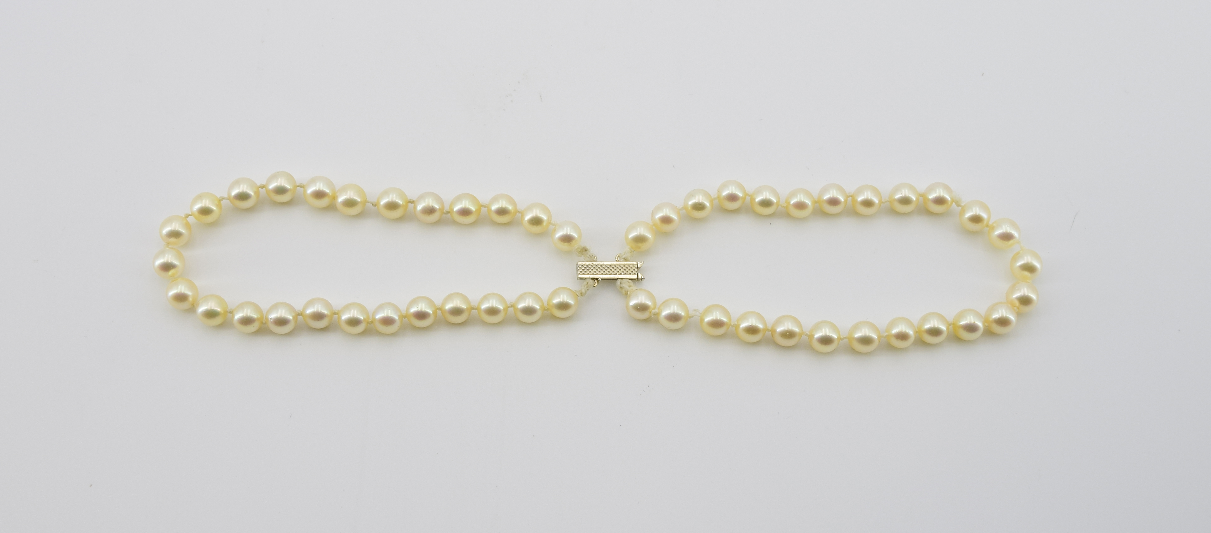 podwójny sznur z 50 szt. pereł o delikatnym różowym overtonie o śr. 6.50-7.10 mm,