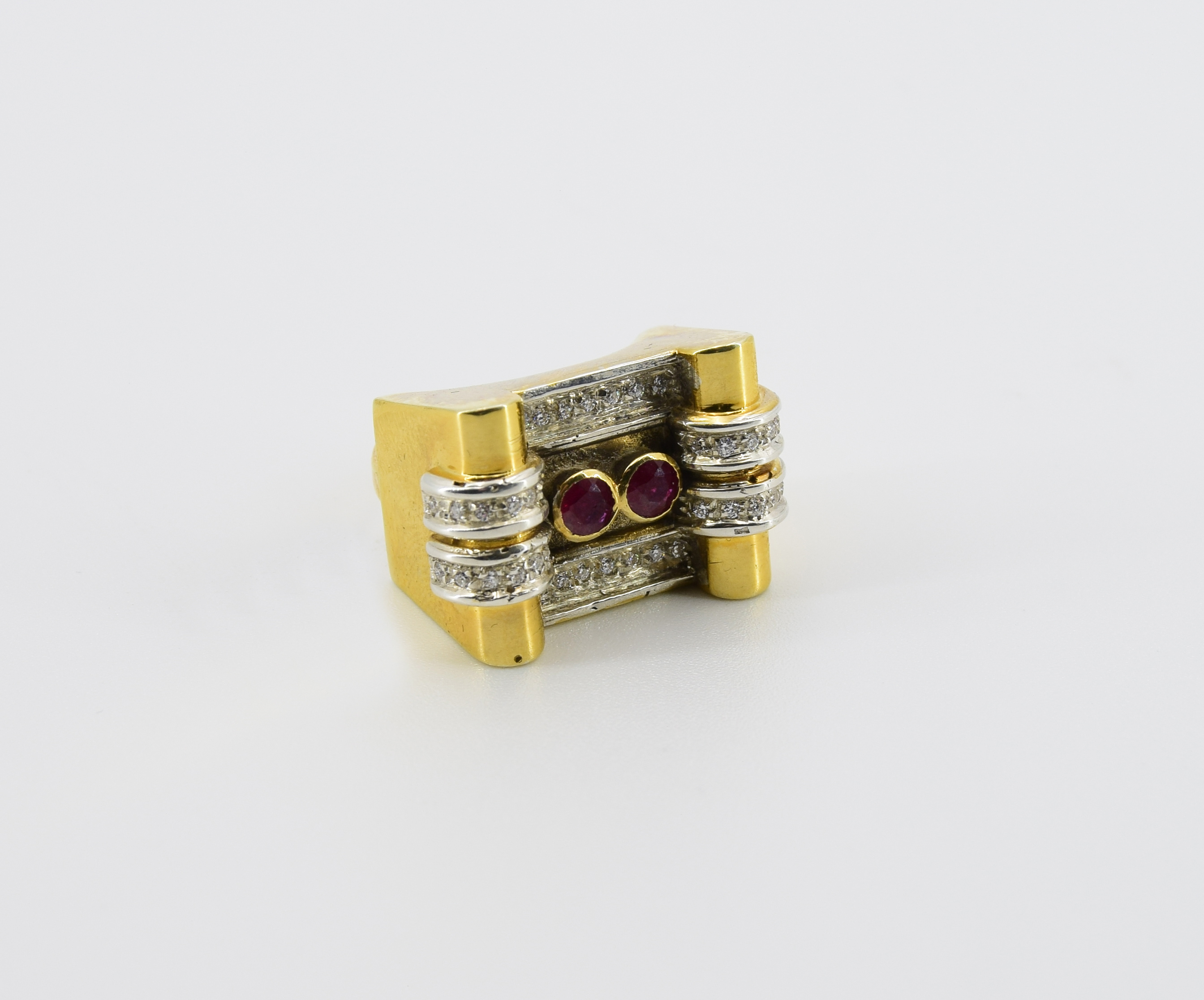 2 szt. okrągłych rubinów oraz 36 szt. diamentów w szlifie przejściowym;
