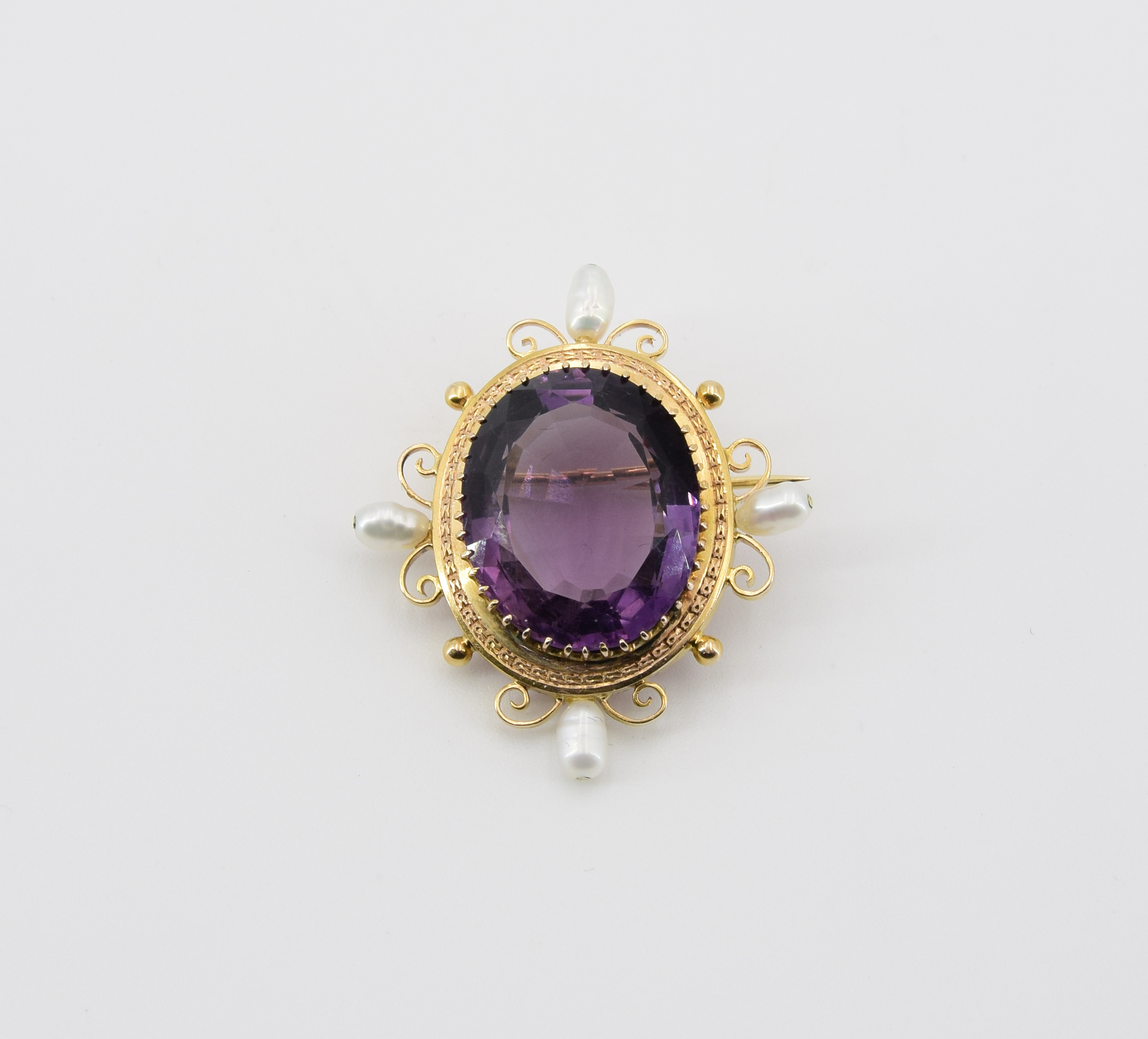 kompozycja z owalnym, fasetowanym ametystem o masie ok. 29.00 ct oraz 4 szt. pereł o wym. 3.30-6.10 mm,