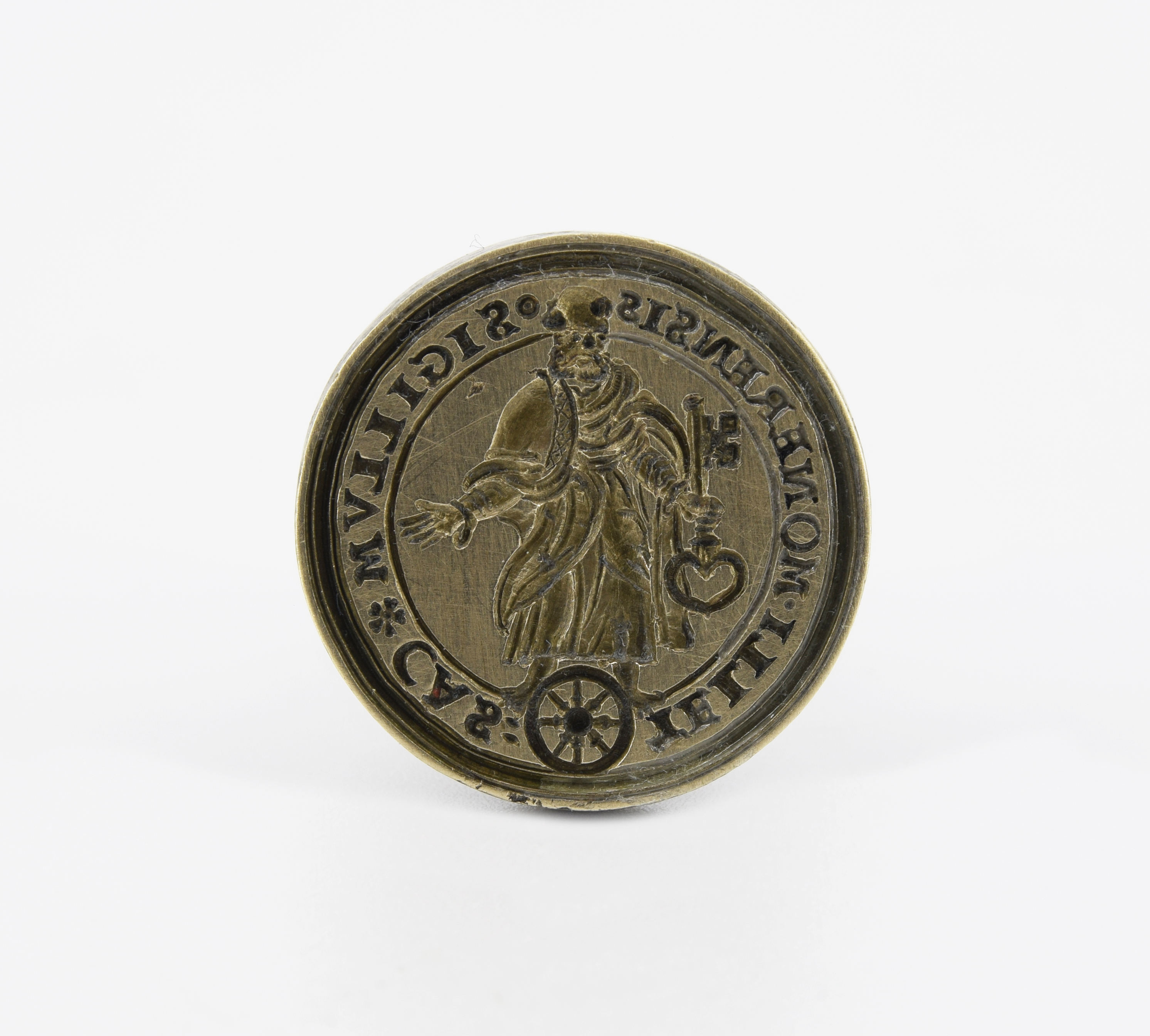 mosiądz; średnica pola pieczętnego 3,1 cm; wys. 3,5 cm; w polu pieczętnym: postać w szatach z kluczem (do bramy zamku), poniżej koło z ośmioma szprychami; w otoku napis: SIGILLUM CASTELLI MONERENSIS. Polska, I poł. XVIII w. W Radzyniu koło Grudziądza istnieje zamek krzyżacki, który po pokoju toruńskim w 1466 przypadł Rzeczypospolitej. W XVIII w. starostwo niegrodowe chełmskie posiadało dwóch magnatów Czapskich i z ich okresu pochodzi ta pieczęć. Napis w otoku oznacza "PIECZĘĆ ZAMKU W ..."; monere - z łaciny oznacza "radzić", jest to zlatynizowana forma nazwy miasta Radzyń. O tej miejscowości świadczy też koło z ośmioma szprychami - herb miasta Radzynia. Inne miasta w Europie posiadające herb z kołem nie mają zamków albo ich nazwy nie pasują do tej z pieczęci. Unikalny rodzaj pieczęci władcy zamku. Zwraca uwagę artystyczne wykonanie, prawdopodobnie pracowni w Gdańsku. Pochodzenie: pieczęć nabyta w latach 80-tych XX w. w Gdańsku, wraz z dwiema pieczęciami z herbem Leliwa Czapskich.
