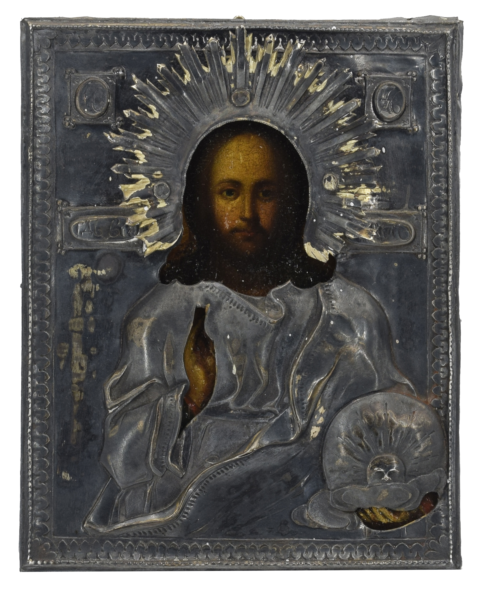 olej, deska, podkład; okład: srebro pr. 84; 17,6 x 13,7 x 2,8 cm; na okładzie w dolnej krawędzi punce: próba srebra, cecha miejska - Święty Jerzy, inicjały cyrylicą: ND [Nikołaj Dubrovicz (czynny 1822-1855)], inicjały złotnika cyrylicą "JaM" [Jakov Gierasimov Moiseyev (czynny k.XVIII-pocz. XIX w.)] oraz data 1829; dwa wsporniki pogrążone w sztorcach ikony; Rosja, Moskwa, 1829. Wizerunek Zbawiciela z uniesioną prawą dłonią w geście błogosławieństwa. Ułożenie palców nawiązuje do greckiego monogramu Chrystusa: IC XC. Połączone są dwa palce: kciuk z serdecznym. Dzięki temu palce wskazujący i zgięty środkowy przypominają litery IC. Skrzyżowane ukośnie kciuk i serdeczny w zestawie z małym palcem tworzą XC. Ułożenie interpretuje się również jako dwoistości natury Chrystusa: boskiej i ludzkiej oraz Trójcę Świętą. W lewej dłoni Zbawiciel trzyma kulę. Nad Zbawicielem, na wysokości promienistego nimbu w kartuszach medaliony z monogramem, skrótem od imienia IC XC. Kompozycja sukienki repusowanej w srebrze otacza wąska bordiura dekorowana rozetami. Na szczególną uwagę zasługuje klasa wykonania sukienki srebrnej. Zachowana oryginalna, naturalna patyna czasu.