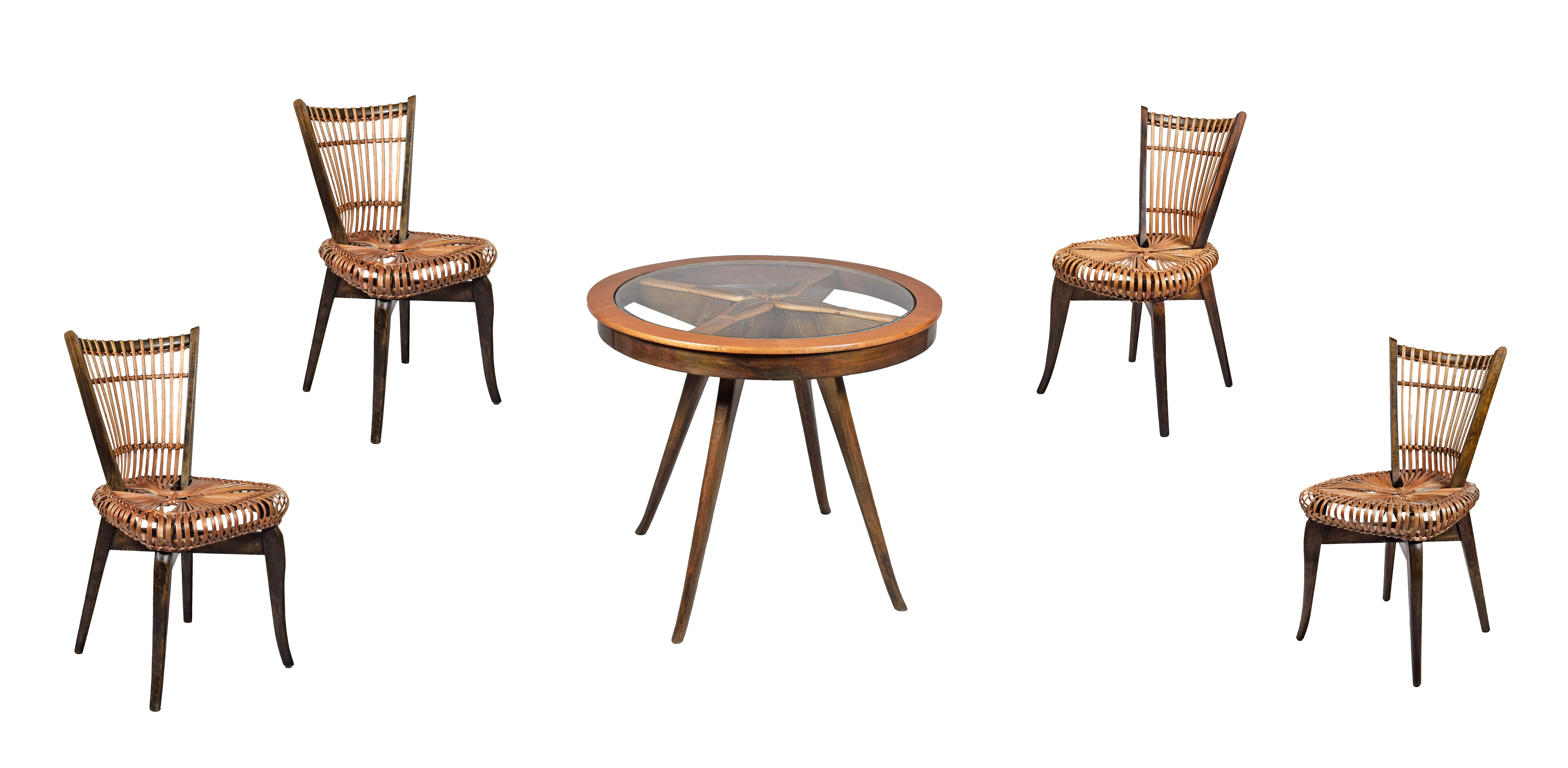 wiklina, drewno (olcha lub brzoza), szkło; stół: wys. 73,5 cm; średnica blatu 83,5 cm; krzesła: wys. 79 cm; głęb. 45 cm; Polska, ok. 1955. Komplet złożony z czterech krzeseł z wiklinowymi oparciami i siedziskami oraz z okrągłego stołu ze szklanym blatem. Oferowany zestaw pochodzi najprawdopodobniej z dawnej kawiarni Morskiej w Gdańsku Wrzeszczu. Literatura: Janusz Kowalski, Gdańskie kawiarnie i restauracje, "Architektura" 1955, nr 8 s. 231 (il.). Władysław Wołkowski (1902-1986) - polski artysta i designer, nazywany „Michałem Aniołem wikliny” za wyjątkowe i innowacyjne podejście do tego materiału. Rozpoczął edukację w latach 20. w Kazimierzu nad Wisłą i kontynuował ją pod opieką Wojciecha Jastrzębowskiego - również projektanta - co umożliwiło mu udział w przygotowaniach polskiej ekspozycji na Wystawę Światową w Paryżu (1925). W 1935 r. ukończył Szkołę Sztuk Pięknych w Warszawie. Głównym medium Wołkowskiego stała się wiklina, a jego projekty cieszyły się uznaniem jeszcze przed II wojną światową. Pod koniec lat 30. XX w. były prezentowane na prestiżowych wystawach w Berlinie, Paryżu oraz Nowym Jorku, a w 1937 roku, podczas paryskiej ekspozycji „Sztuka i technika w życiu współczesnym”, twórczość Wołkowskiego została uhonorowana złotym medalem. Artysta eksperymentował z różnymi formami i technikami plecionkarskimi. Jego prace charakteryzowały się unikalnym stylem, który łączył tradycję z nowoczesnością. Wykorzystując naturalne właściwości wikliny, tworzył meble, które były zarówno funkcjonalne, jak i estetyczne. Meble jego projektu znalazły się także w reprezentacyjnych wnętrzach budynków rządowych, w tym w siedzibie ambasady w Berlinie. Pod koniec lat 50. XX w. artysta realizował rozległe zamówienia dla dworów królewskich w Belgii i Wielkiej Brytanii. W Polsce zaś jedną z najbardziej znanych realizacji było kompleksowe wyposażenie Hotelu Merkury w Poznaniu.