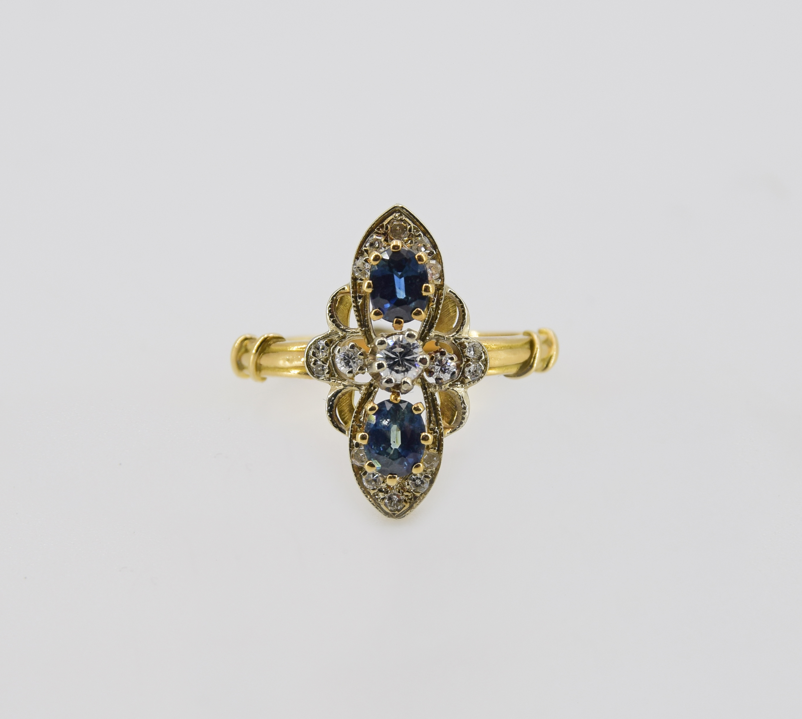 2 szt. owalnych, fasetowanych szafirów oraz 3 szt. brylantów i 14 szt. diamentów w szlifie 8/8 ;