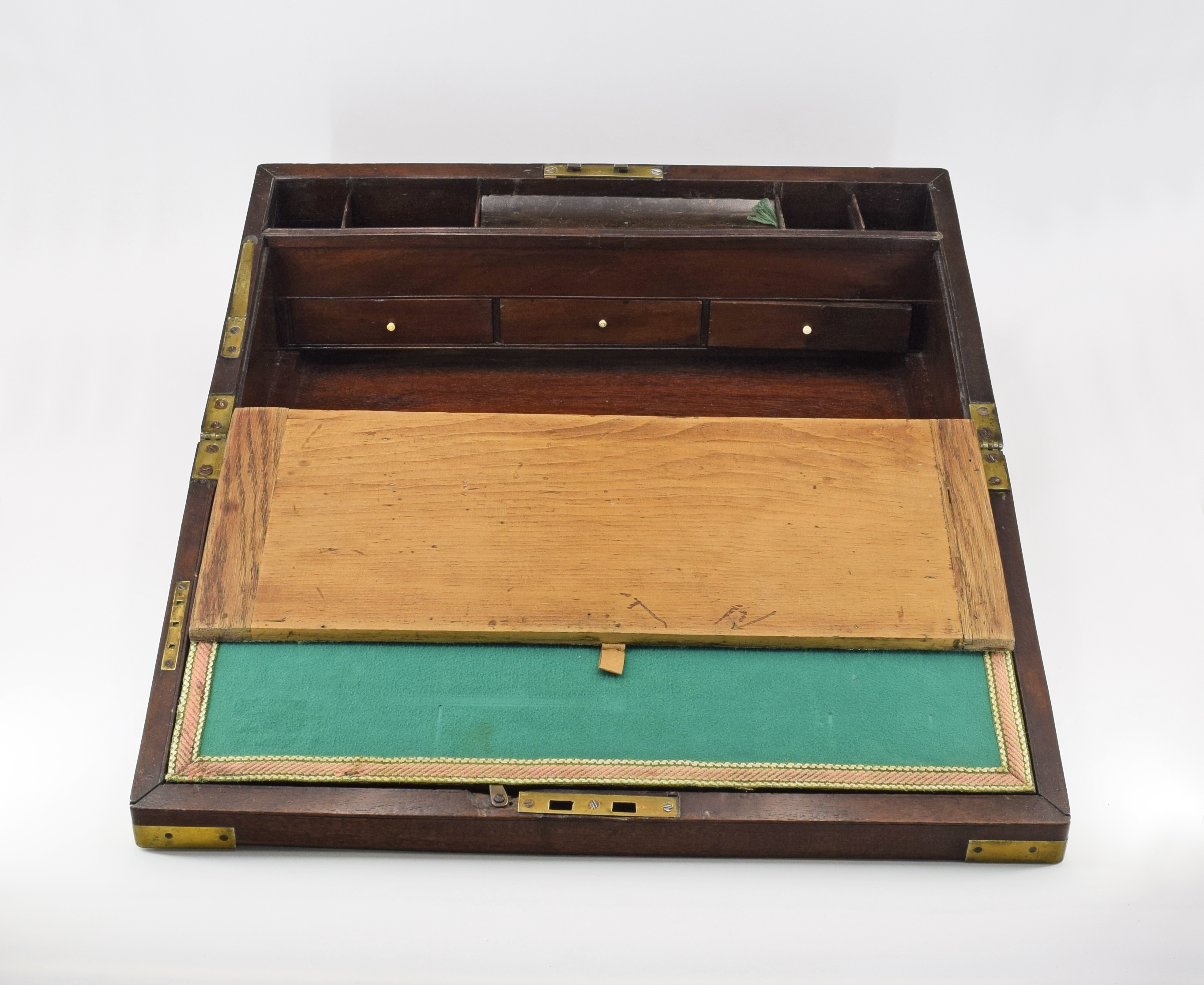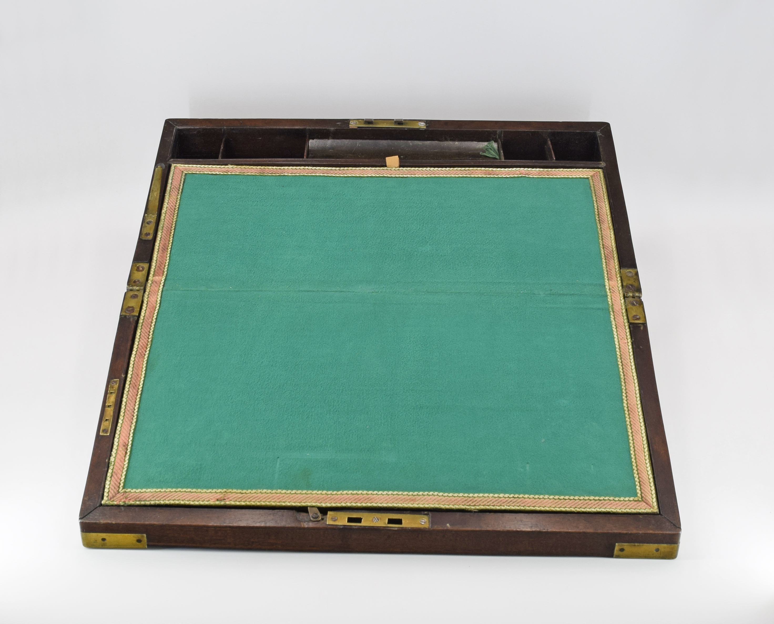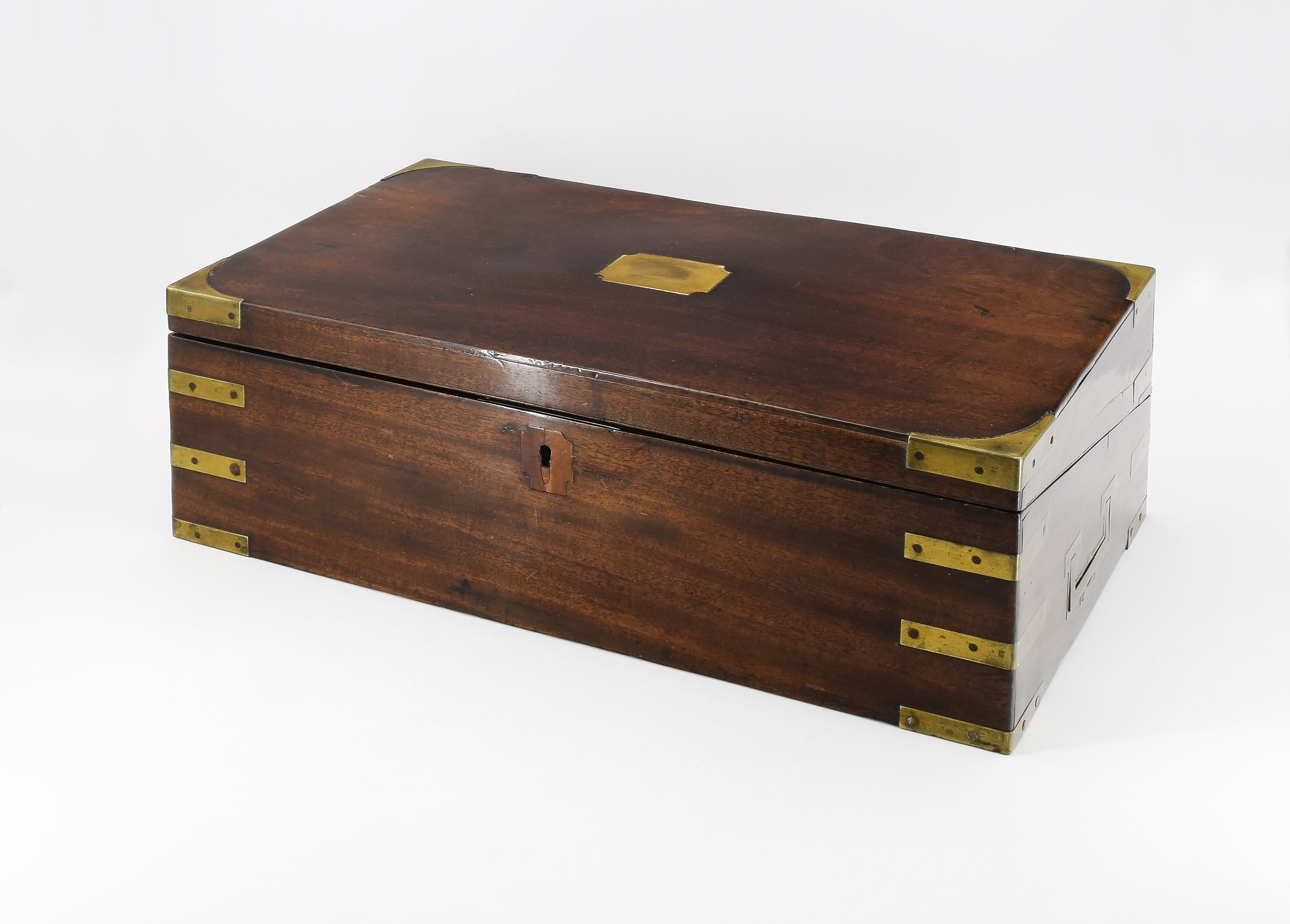 drewno (mahoń), mosiądz, tkanina, pasmanteria; wys. 17,5 cm, szer. 50 cm, głęb. 27 cm (po rozłożeniu 54,5 cm).