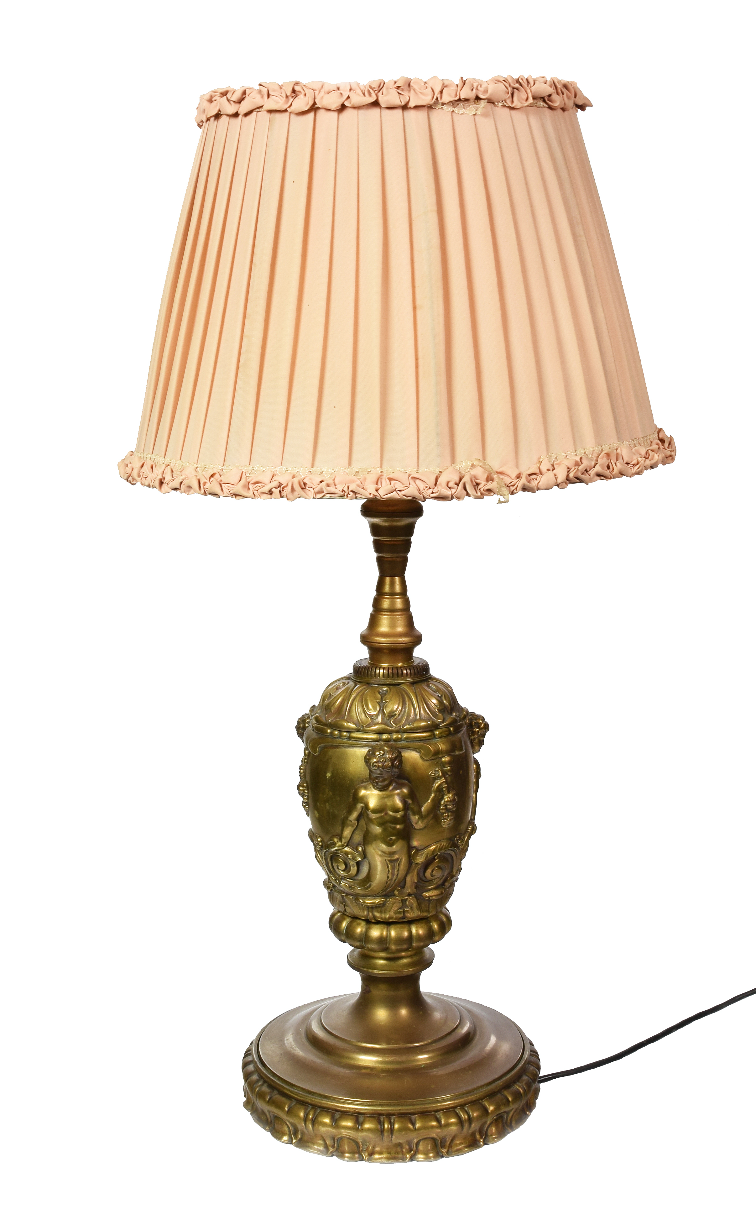 blacha mosiężna, abażur współczesny, z tkaniny na drucianym stelażu, dobierany; wys. całk. 90 cm.