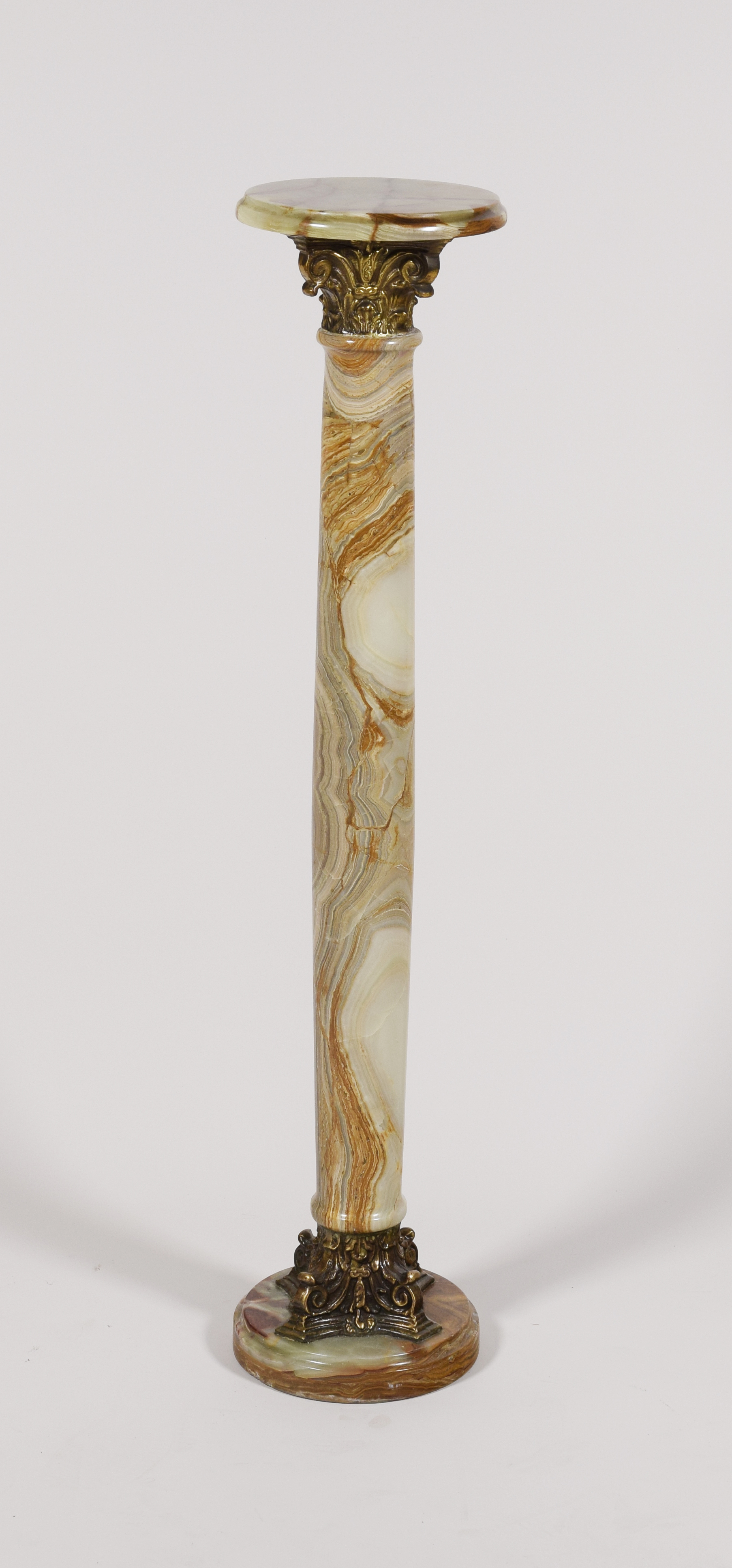 onyks alabastrowy, zielonkawy, z brązowymi żyłkami, brąz; wys. 106 cm; średnica górnego blatu 22,5 cm;