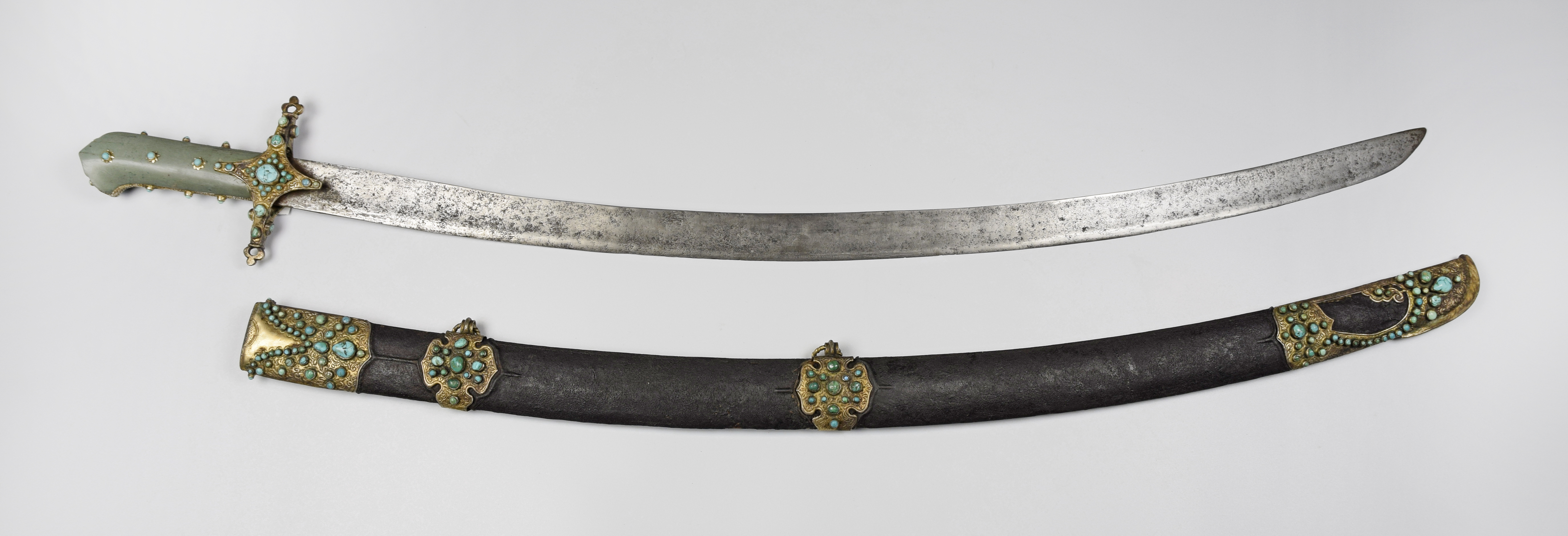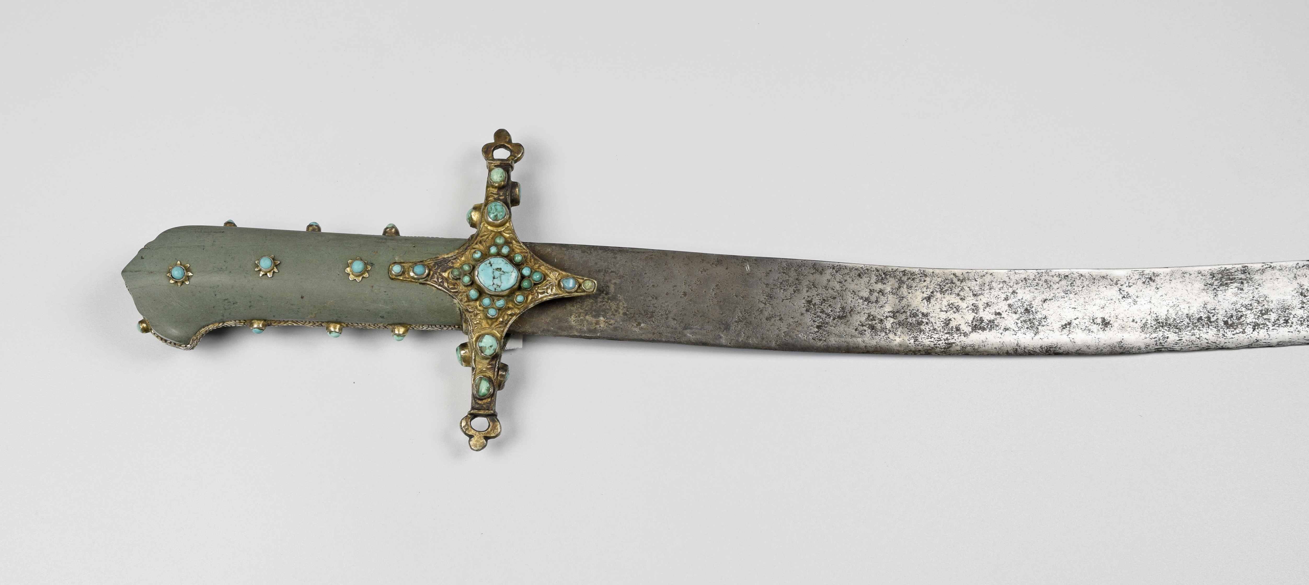 stal, mosiądz, skóra; okładziny rękojeści - kamień; oprawa ze złoconego srebra ozdobiona turkusami. dł. całk. 97 cm.