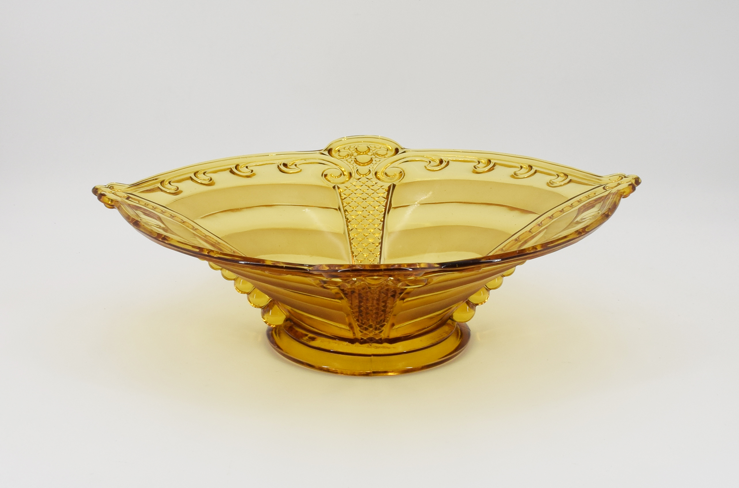 szkło przeźroczyste, miodowe, prasowane; średnica przy krawędzi: 38 x 36 cm.