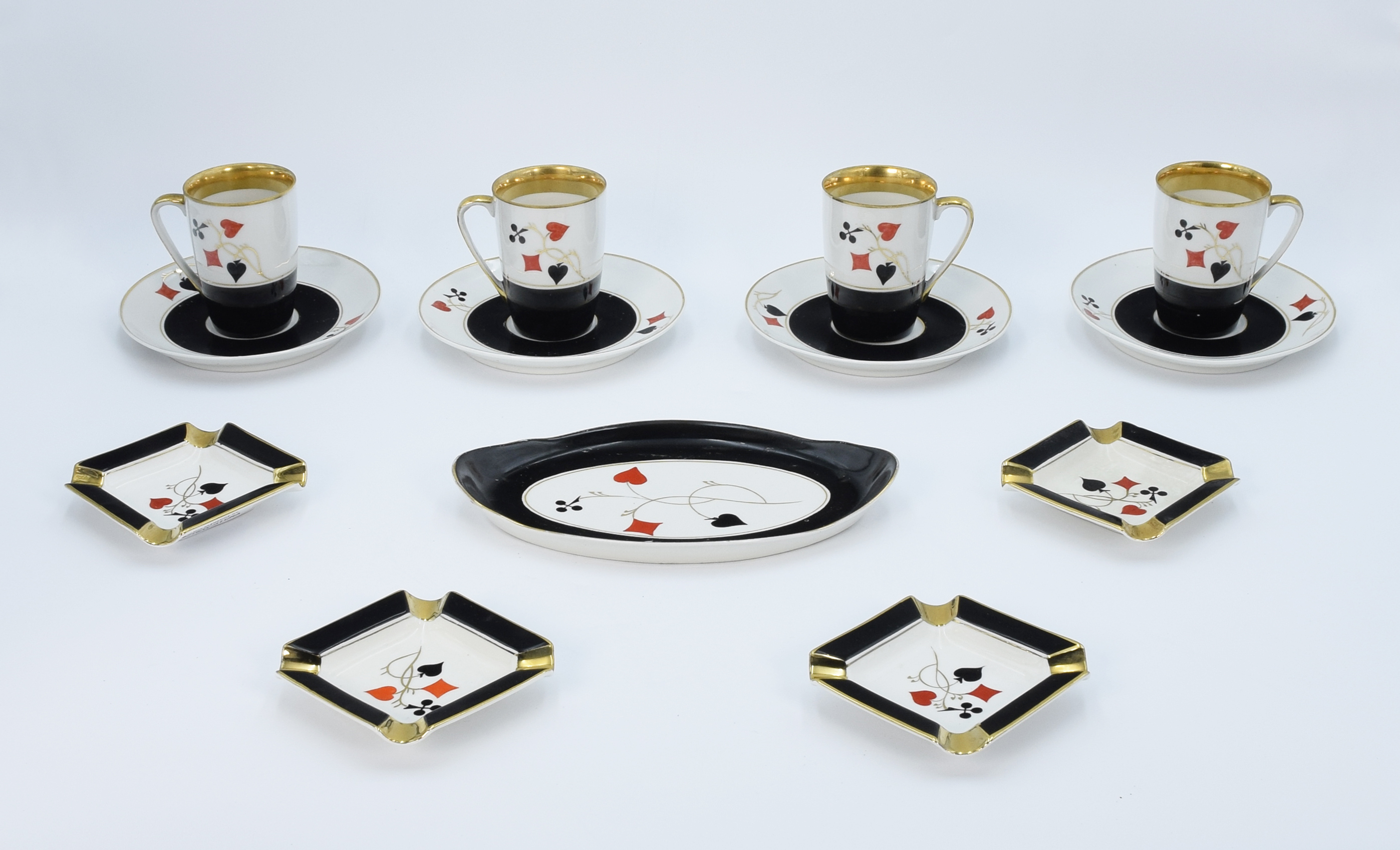 4 filiżanki ze spodkami, owalna płaska paterka, 4 popielniczki;