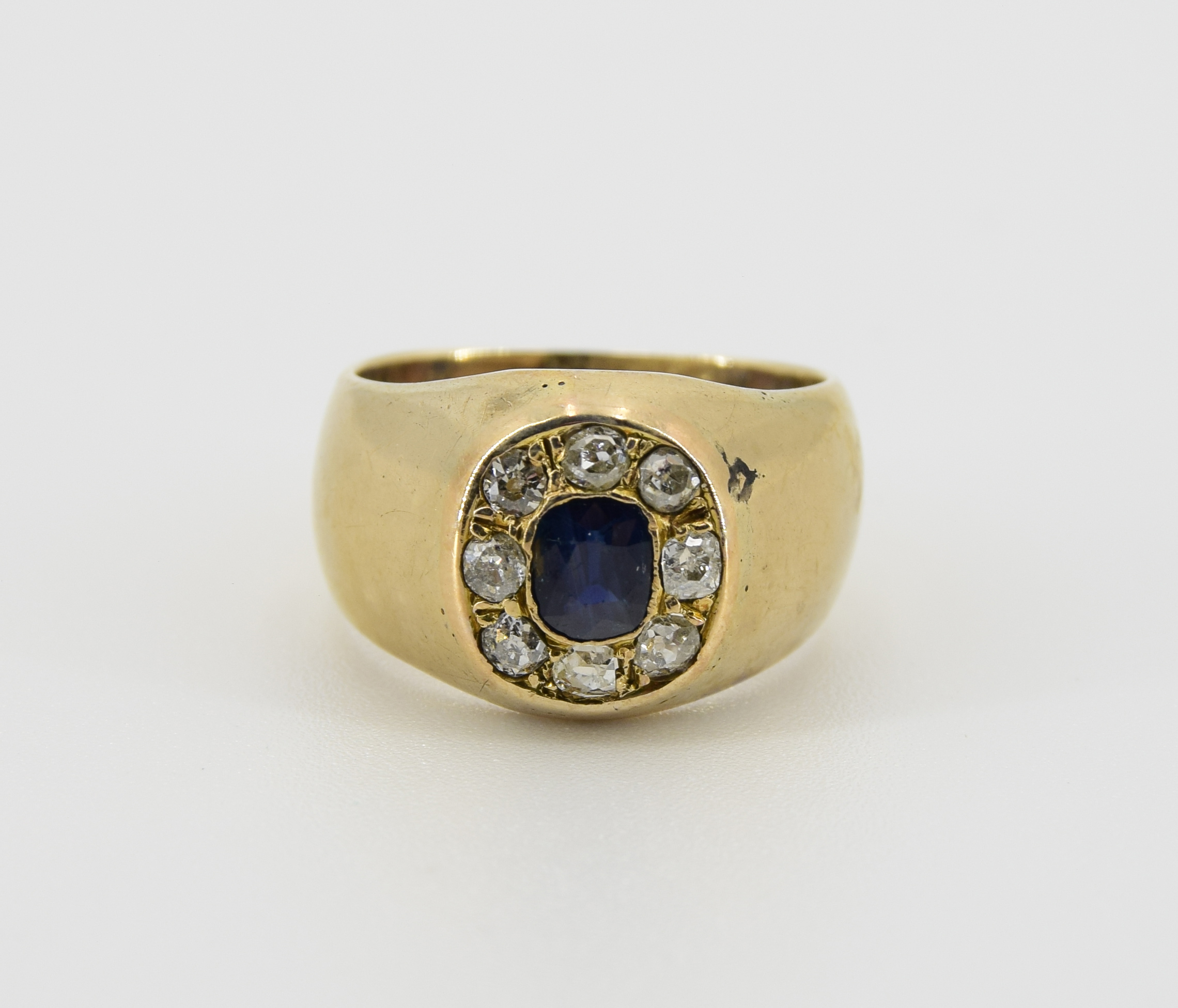 szafir w otoczeniu 8 szt. diamentów w starym szlifie europejskim;