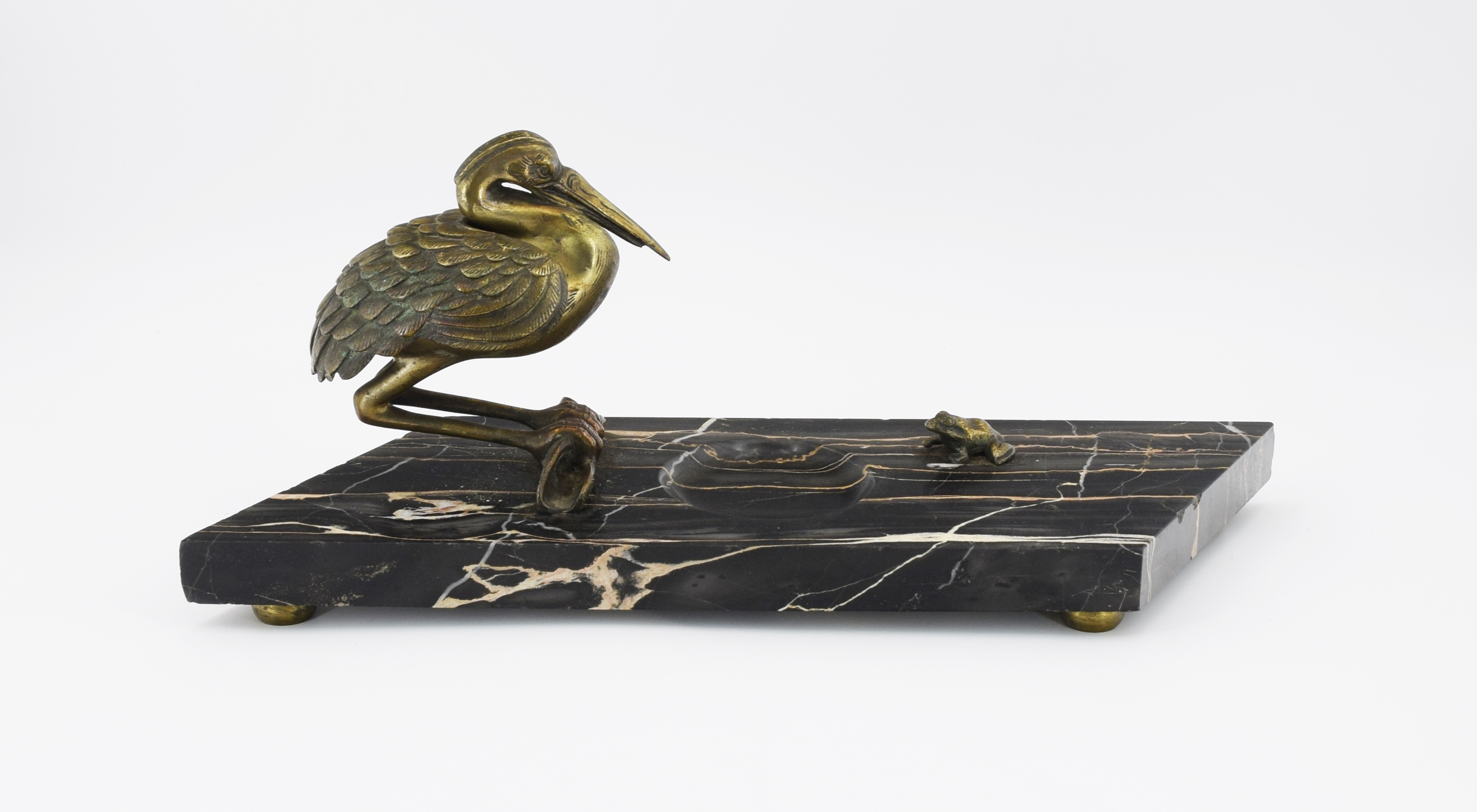 marmur, rzeźby z brązu; ruchome skrzydła czapli ukrywają kałamarz; wymiary: 17 x 41 x 13,5 cm.