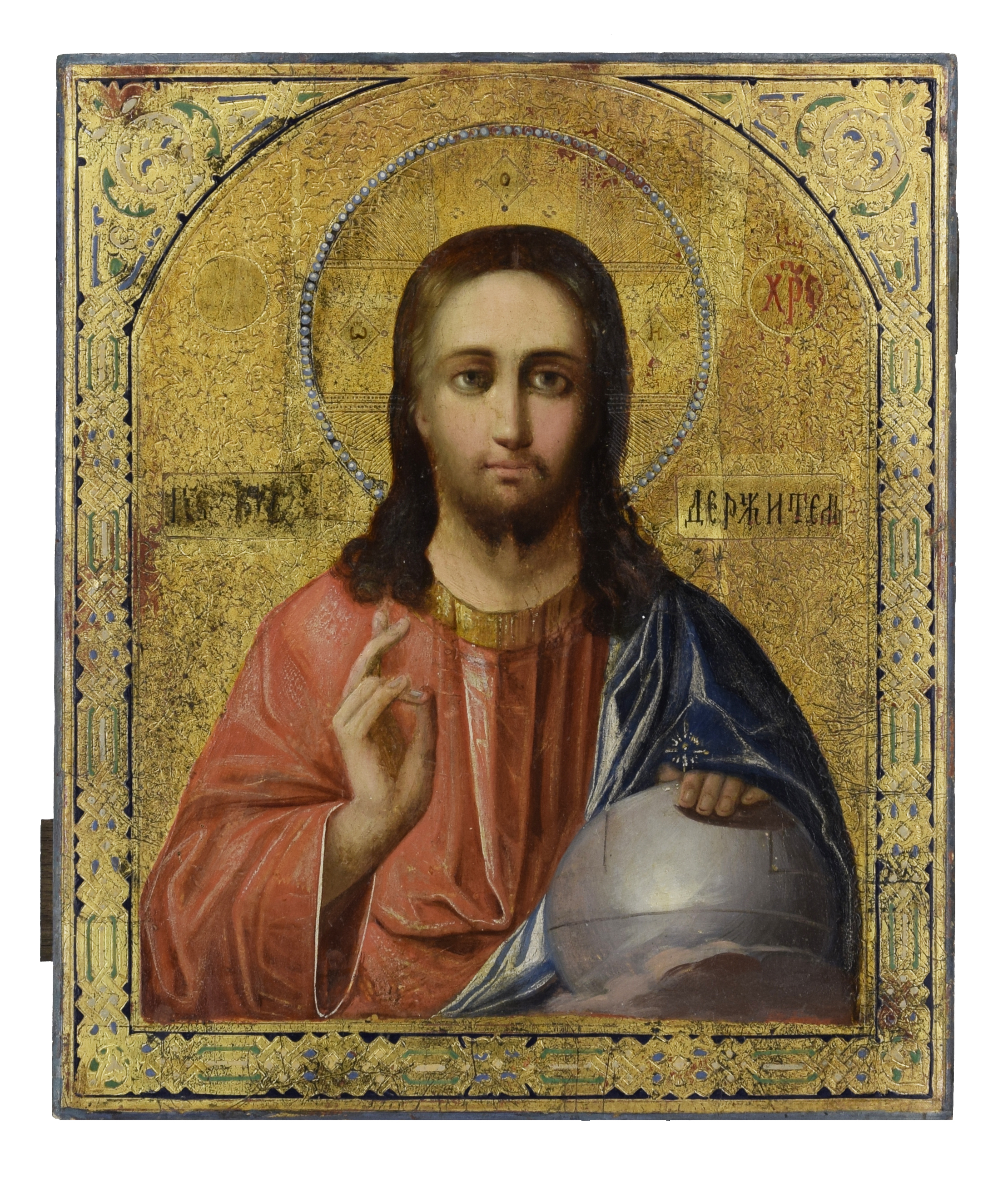 olej, deska cyprysowa, podkład kredowo-gipsowy, złocenia; 31,3 x 26,5 x 2 cm; z tyłu dwie dębowe szpongi. Rosja, Moskwa, k. XIX w. Wizerunek Zbawiciela z uniesioną prawą dłonią w geście błogosławieństwa. Ułożenie palców nawiązuje do greckiego monogramu Chrystusa: „IC XC”. Połączone są dwa palce: kciuk z serdecznym. Dzięki temu palce wskazujący i zgięty środkowy przypominają litery IC. Skrzyżowane ukośnie kciuk i serdeczny w zestawie z małym palcem tworzą XC. Ułożenie interpretuje się również jako dwoistość natury Chrystusa: boskiej i ludzkiej oraz Trójcę Świętą. Lewą dłoń Zbawiciel opiera na kuli zwieńczonej Krzyżem. Nimb krzyżowy ujęty motywem błękitnych perełek (atrybut ikonograficzny przysługujący jedynie Zbawicielowi, przypominający o jego śmierci na krzyżu. Na nimbie wypisane są greckie litery oznaczające "Jestem Który Jestem" - imię Boga, przynależne też Boskiej naturze Chrystusa, na jego wysokości w medalionach skrót imienia „IC XC”. Poniżej w wyznaczonych polach napisy objaśniające cyrylicą „Wsiedierżitiel”. Szaty w kolorach podkreślających jego majestat: niebieskie i czerwone, połączenie to daje nam znak niezwykłej harmonii pomiędzy tym co ziemskie, a tym co niebiańskie. Tło złocone z grawerowanym motywem roślinnym, u góry ujęte łukiem. Bordiura również złocona, grawerowana, dekorowana wielobarwnym motywem geometrycznej plecionki. Obramienie ujęte błękitnym pasem.