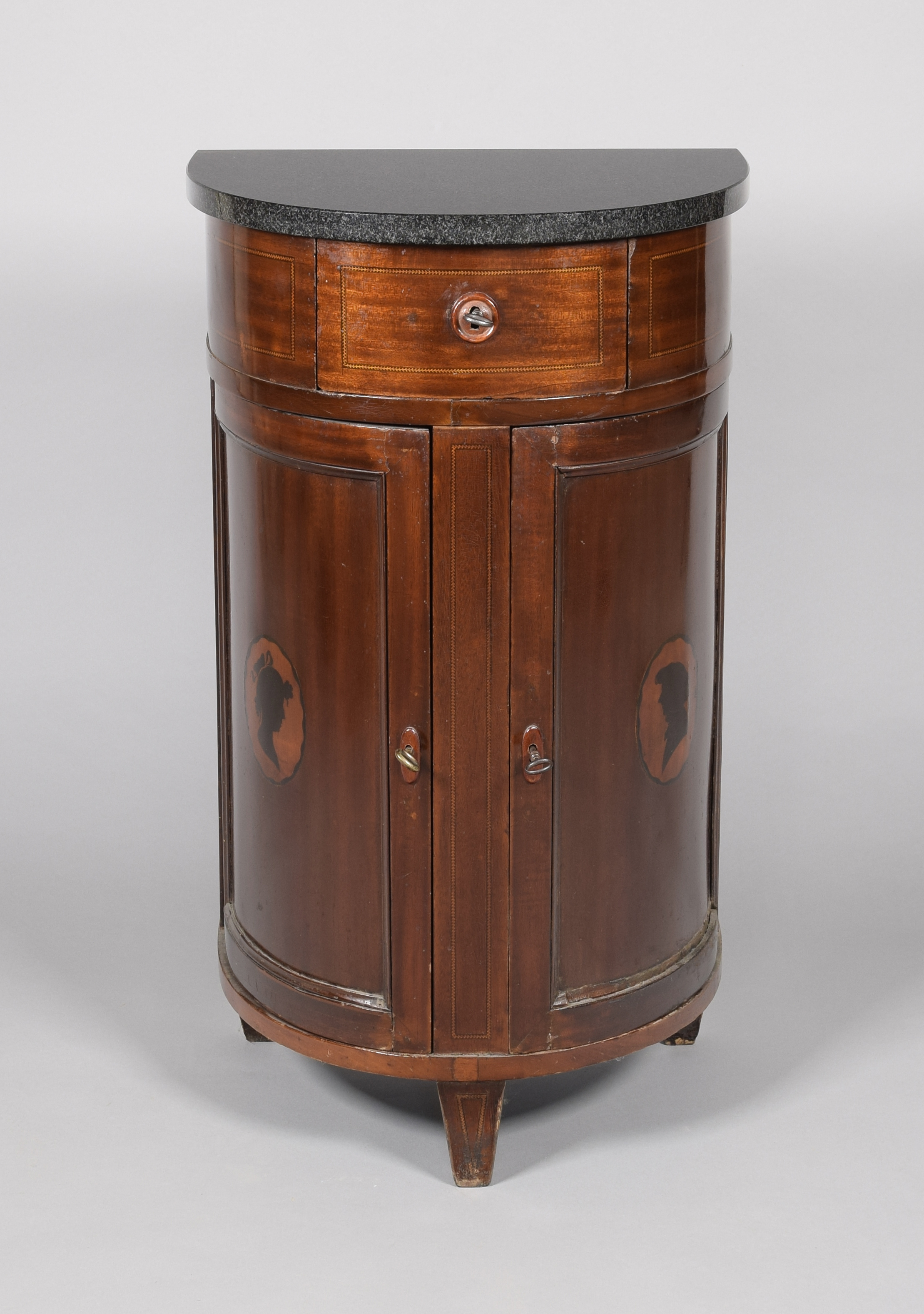 konstrukcja - sosna, fornir - mahoń; 76,5 x 47 x 30,8 cm. Europa Środkowa, pocz. XIX wieku Półokrągła, z marmurowym blatem, z szufladką u góry, zamykana dwuskrzydłowo, fornirowana, z owalnymi intarsjowanymi rezerwami na skrzydłach drzwi, wsparta na trzech nóżkach. Powierzchnie oskrzynienia wraz z licem szufladki oraz słupki miedzy skrzydłami ujęte wąską wstęgą z intarsjowaną gałązką. Skrzydła ramowe z pojedynczymi płycinami, od wewnętrznej strony ujętymi profilowaną listewką. Nóżki graniaste, zbieżne ku dołowi. Na otworach kluczyn drewniane szyldu, szufladki okrągły, profilowany, skrzydeł owalne. Rezerwy z jasnymi polami o falistym obrzeżu z czarnymi popiersiami z profilu, kobiecym po lewej, męskim po prawej, tzw. siluette. W narożach wnętrza, po środku wysokości wsporniki do półki.