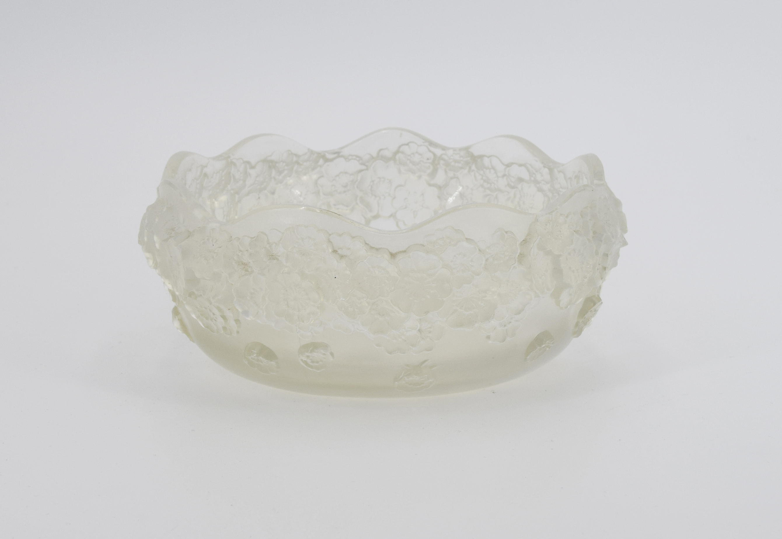 szkło wydmuchiwane w formie, bezbarwne, częściowo matowione, na zewnątrz powlekane; wys. 6,5 cm; średnica 15 cm.