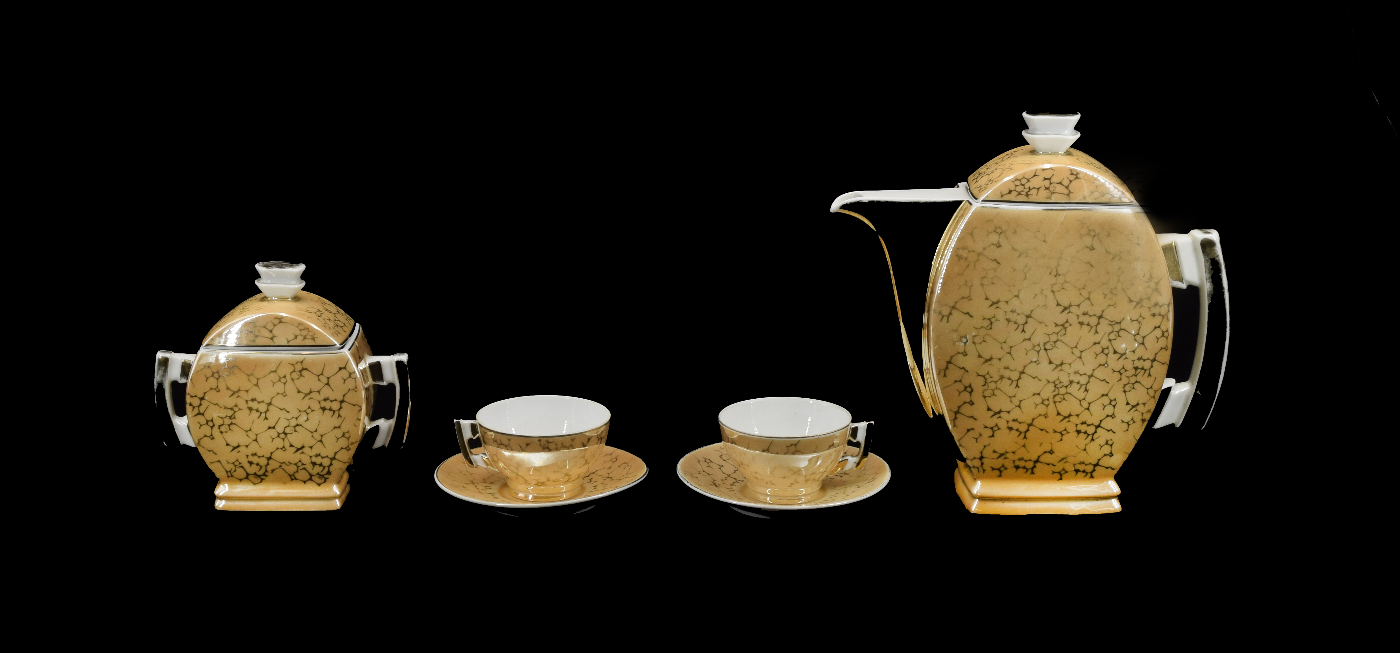 porcelana, farby połyskliwe z dekoracją złoconą z natrysku(?), złocenia;