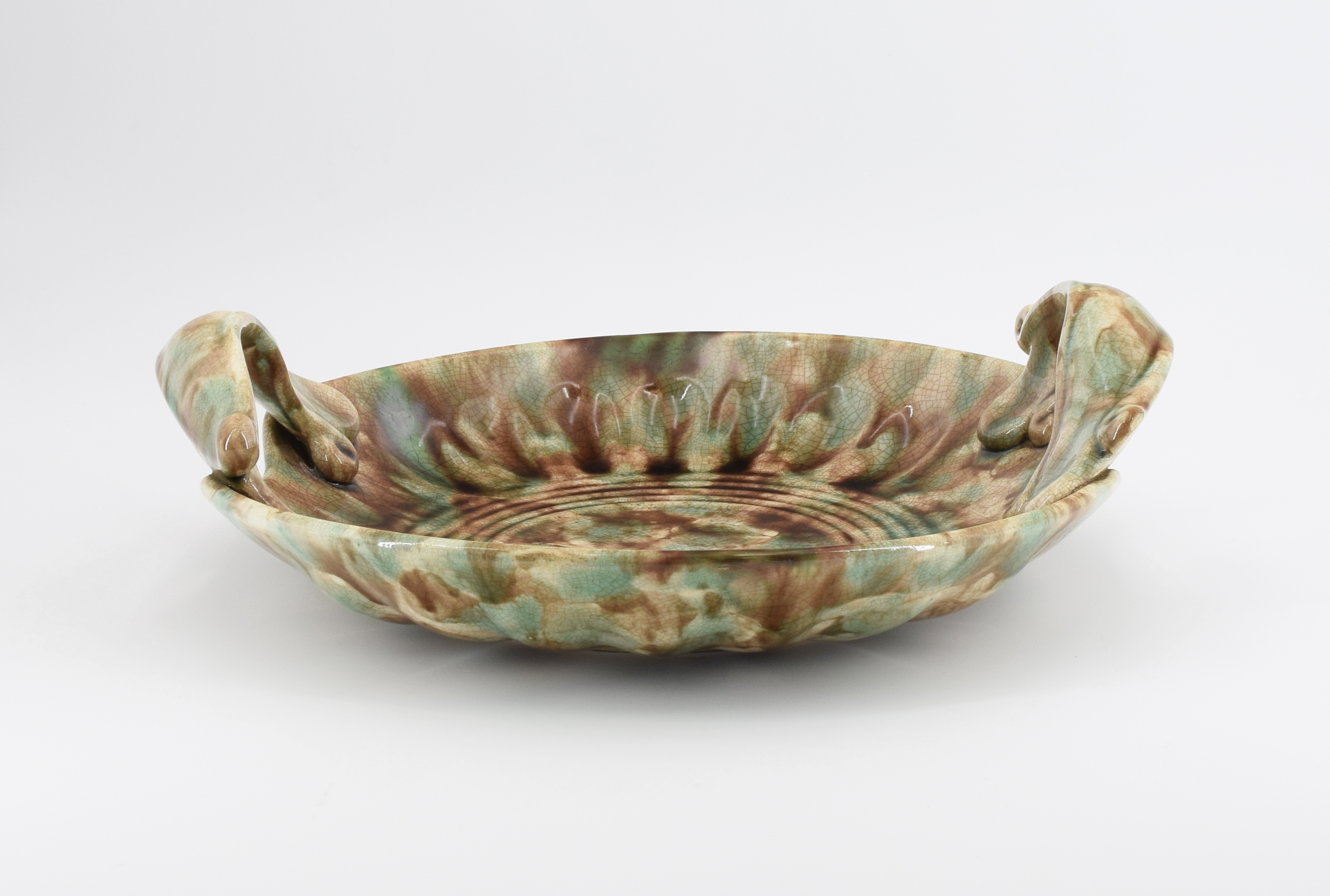 fajans, barwne szkliwa naciekowe i z natrysku, szkliwo ołowiowe z krakelurą; średn. 34 cm;