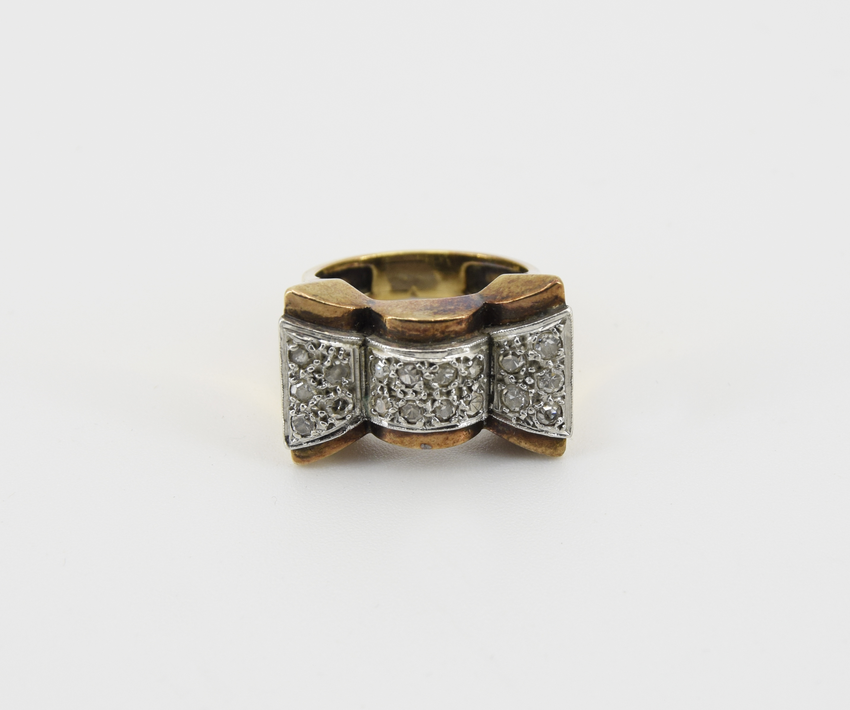 złoto pr. 0.750, masa całkowita 8.740 g., rozm. pierścionka 11.