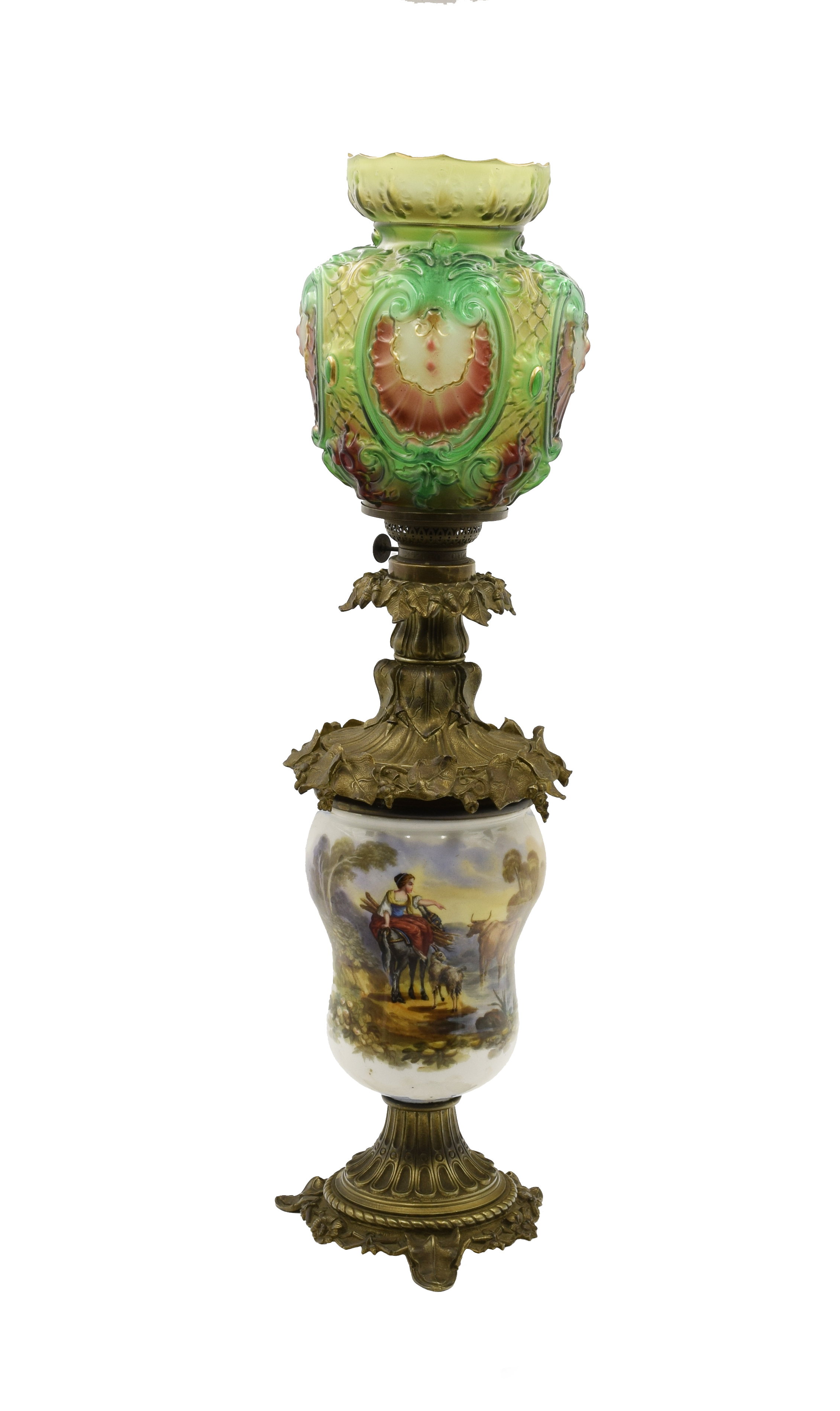 porcelana, brąz, szkło prasowane; wys. 71 cm.