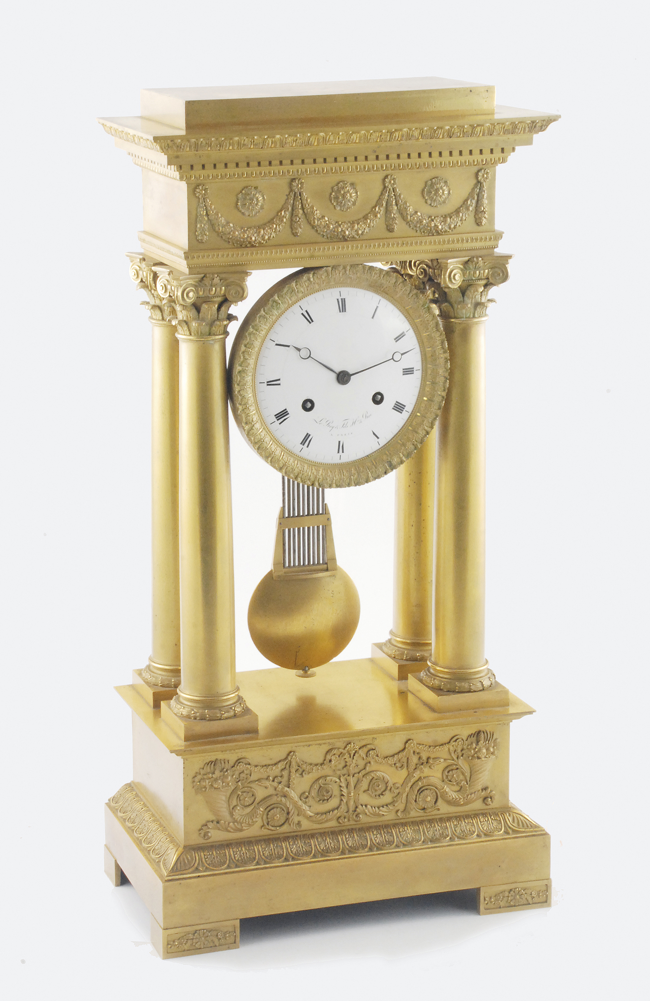 brąz złocony; wys. 63,2 cm, szer. 31,2 cm, głęb. 17 cm. Francja, Paryż, lata 30-40.XIX w. Podstawa na planie prostokąta, wsparta na 4 kątowych nogach, zdobnych z przodu reliefową nakładką z motywem kwiatowym; gzyms z ornamentem palmetowym; cokół dekorowany aplikowaną dekoracją z rogami obfitości, girlandami, rozetami i akantowymi wolutami; wyżej architektoniczna struktura z czterema gładkimi kolumnami o kompozytowych kapitelach, podtrzymującymi architraw z fryzem zdobionym girlandami owocowo-kwietnymi; szeroki gzyms z pasami wolich oczek i palmet; pomiędzy kolumnami umieszczony mechanizm z systemem paryskim bicia godzin i półgodzin oraz regulatorem wahadłowym, rusztowym z dużą, kolistą soczewką; na płycie mechanizmu bite numery: „P /1030 / P” i „437”; tarcza pokryta białą emalią, z cyframi rzymskimi i napisem łukowym u dołu: „Le Roy & Fils Hrs du Roi”; Tradycje wielkiej, rozgałęzionej dynastii zegarmistrzowskiej Le Roy sięgają XVI wieku. Jednym z najbardziej znanych przedstawicieli tej familii był Julien Le Roy (1686-1759),z tytułem zegarmistrza królewskiego, a także jego brat Pierre i starszy syn - również Pierre. Założycielem pracowni posługującej się nazwą „Le Roy & Fils” był Basile-Charles Le Roy (1765-1839). Prowadził ją od 1828 razem z synem Charles-Louis’em (1794-1865); w 1835 uhonorowany został tytułem zegarmistrza królewskiego.