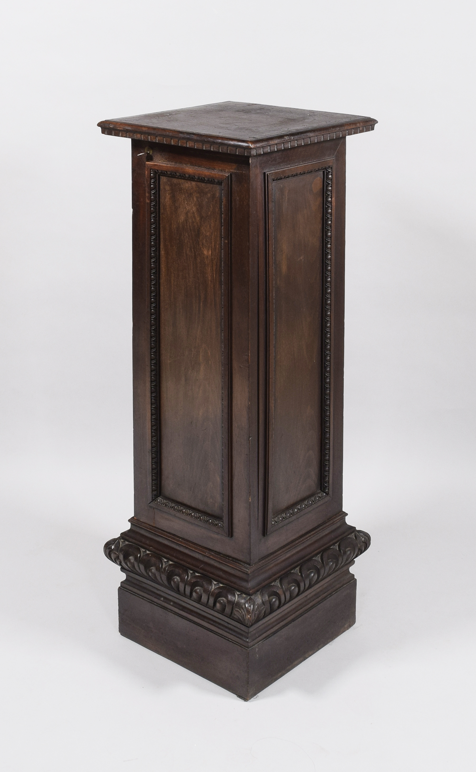dębina, mahoń, drewno liściaste barwione na mahoń; 120 x 42,5 x 42,5 cm.
