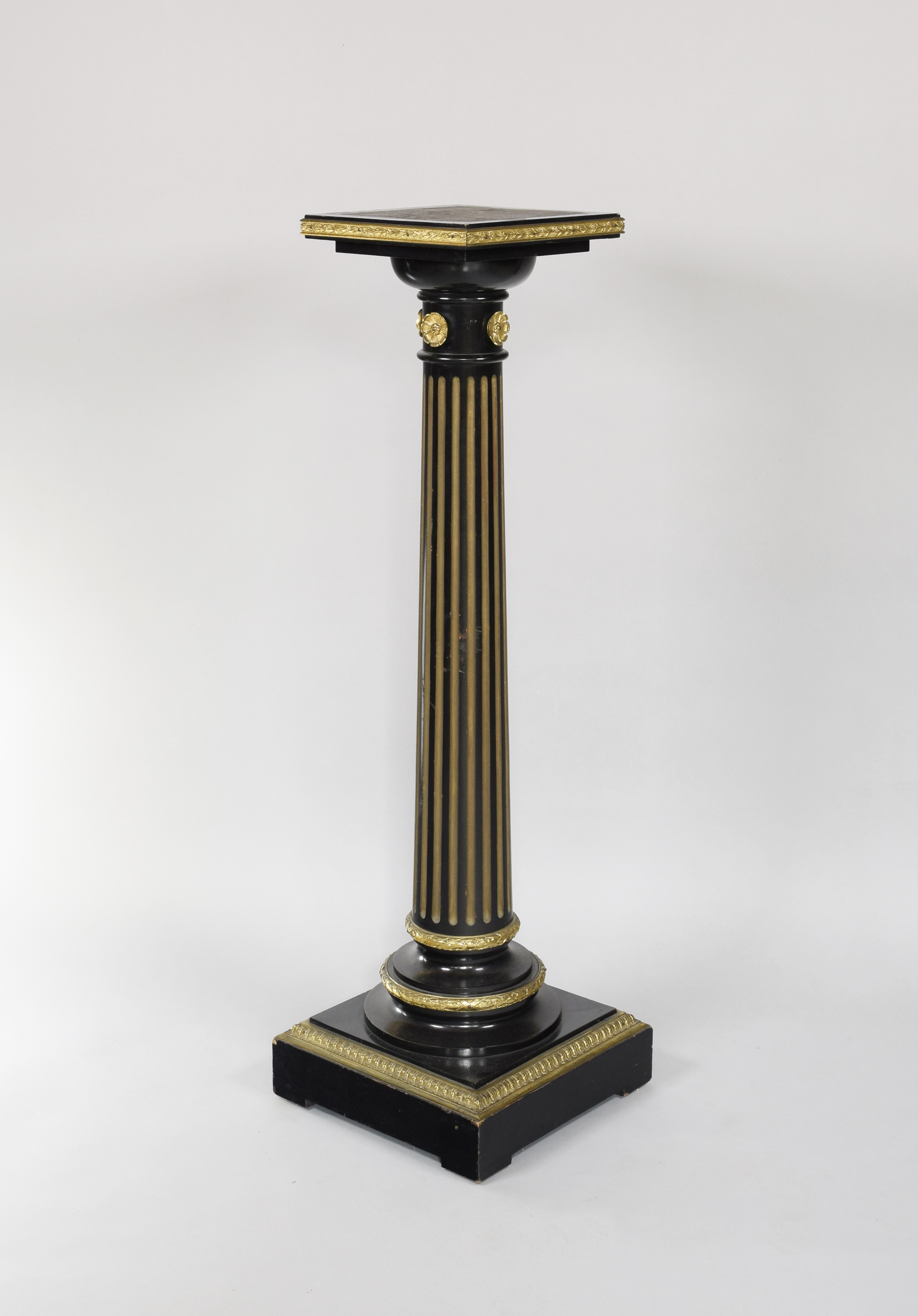 drewno liściaste, mosiądz; wys. 111 x 34,5 x 34,5; blat 26 x 26,5 cm.