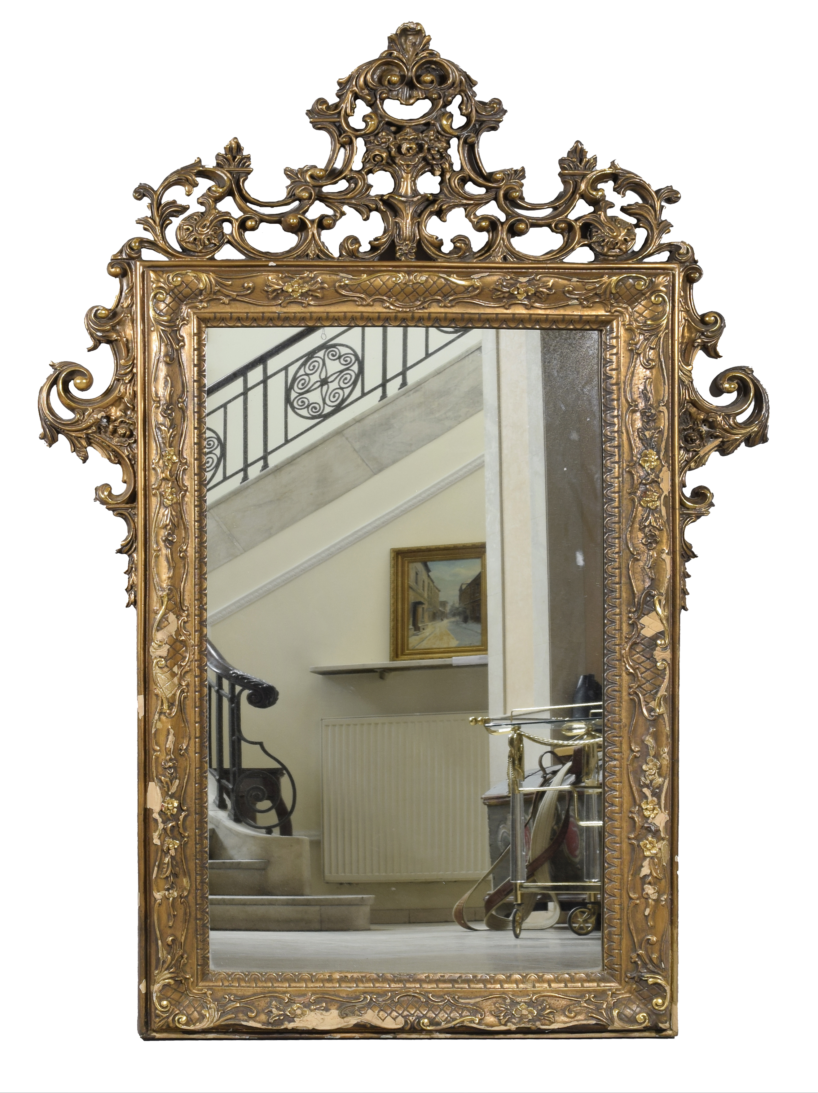 drewno iglaste, masa gipsowo-klejowa, tafla lustrzana; 155,5 x 103 x 6 cm; tafla lustra: 99 x 54 cm.